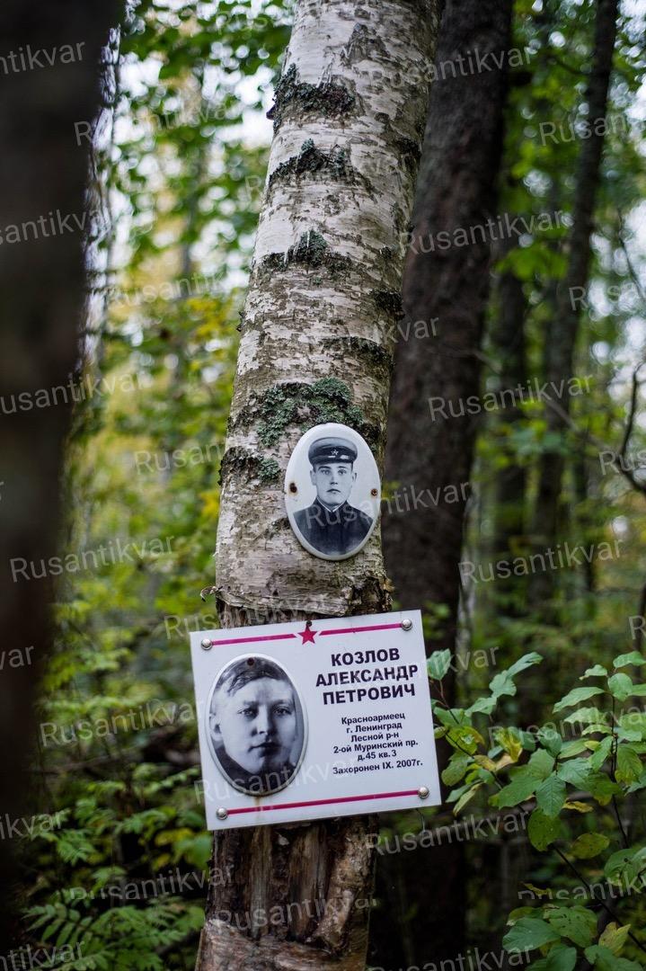 Мужчины уезжают на разведку, а мы (девчонки, да Стас с Андрюхой), остаёмся на старом месте, и под гул машин продолжаем искать солдат. Выходим на новое место, чуть подальше от трассы. Для нас оно новое, а вот для местных и заезжих поисковиков основательно покопанное. Раскопы практически везде - свежие и давние, большие и маленькие. Упираюсь взглядом в березу и вдруг вижу табличку. А с неё на меня смотрят глаза... И дождинка стекает по лицу солдата, поднятого в 2007 году... Читаю и почему- то сердце замирает: «Козлов Александр Петрович, ленинградец».