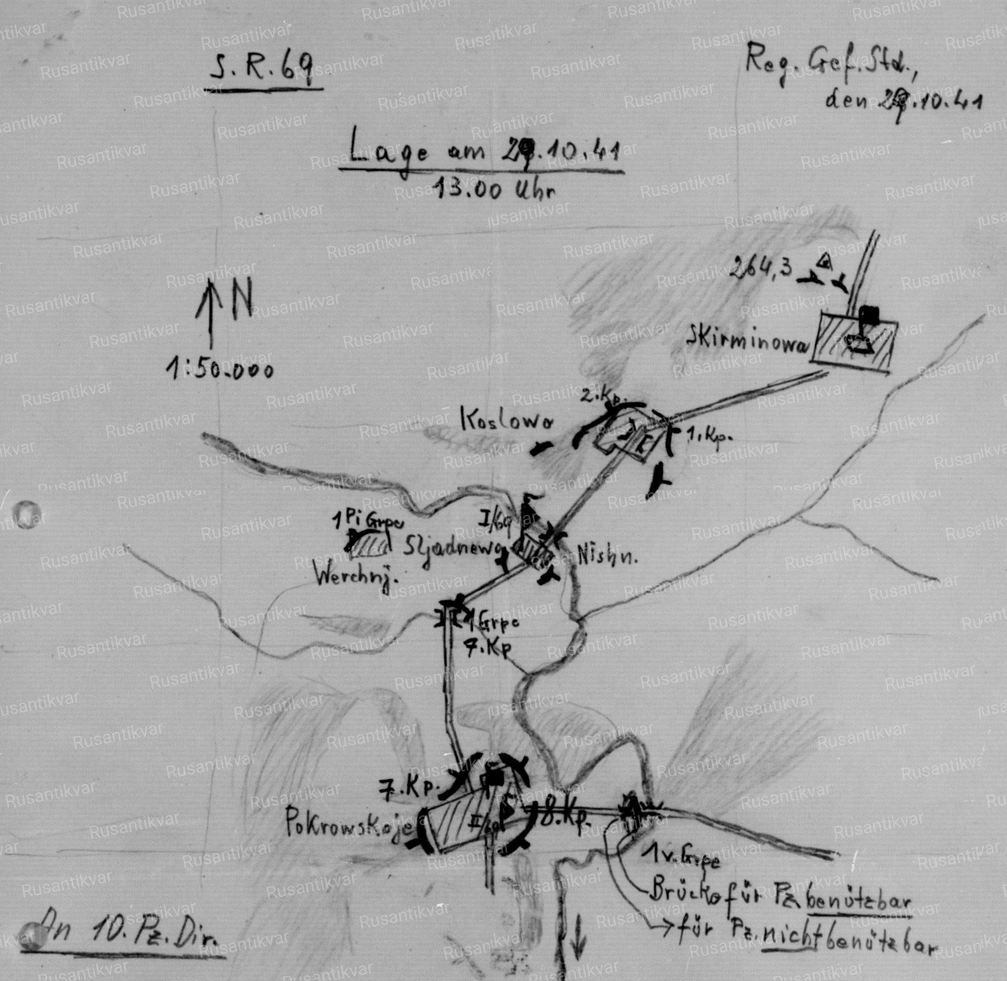 После полуторачасового боя русские отброшены. Часть группы противника отходит в восточном направлении, батальоном захвачено 90 пленных. Оборудуются позиции. Седьмая рота 69-го полка с одним взводом 9-й роты на севере и западе, 8-я рота 69-го полка с одним взводом 9-й роты и тяжёлыми гранатомётами на востоке и юго-востоке. Противотанковый взвод занимает позиции у дороги, идущей из деревни на север. Сапёрный взвод 10-й роты 69-го полка, взвод пехотных орудий и взвод противотанковых орудий остаются у старых строений в центре населённого пункта в качестве резерва батальона. Разведгруппа 8-й роты 69-го полка занимает пост у моста, восточнее Покровского, через речку с названием Озерна. Несмотря на оживлённые действия господствующей в воздухе авиации противника, вторая половина дня, вечер и ясная ночь проходят спокойно» [5,C.288].