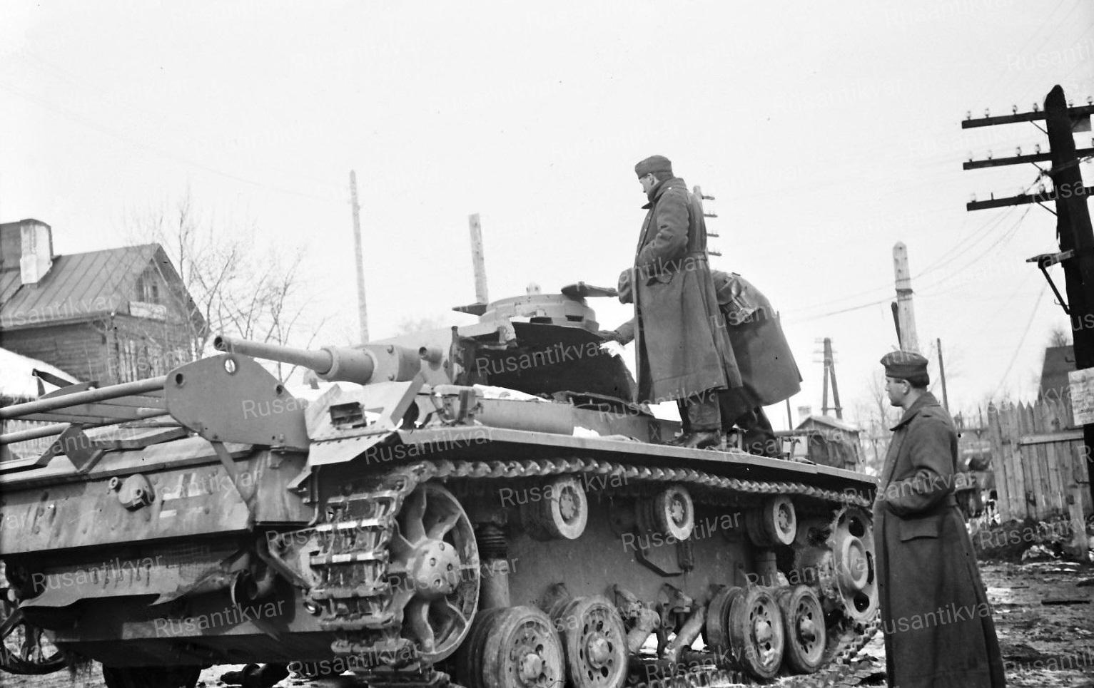 3. Можайск, первые числа ноября 1941 года. Немцы осматривают эвакуированный танк Т-III с фатальными повреждениями. На боку у танка тактический знак 5-й танковой дивизии.