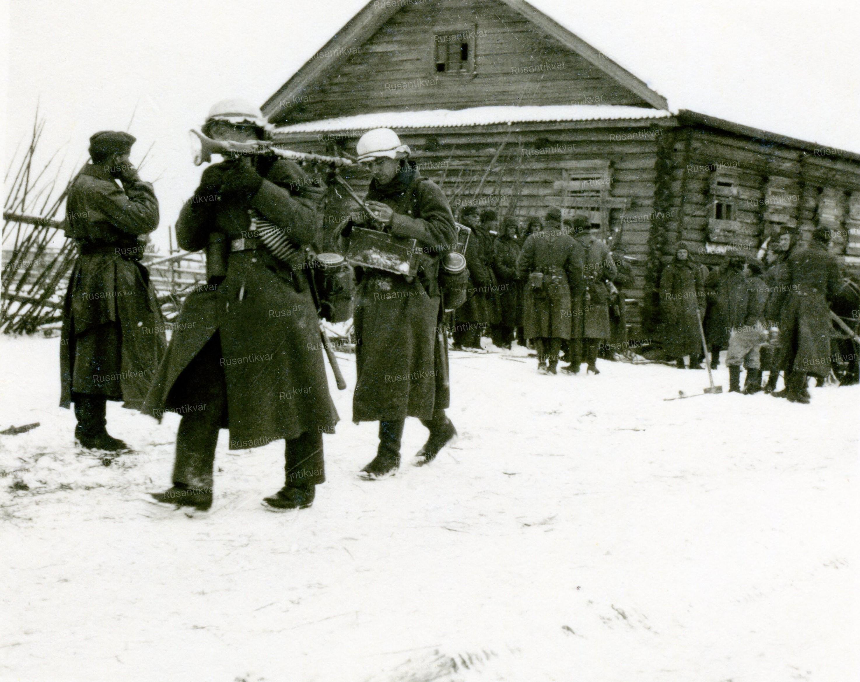 8. Снимок из фотоальбома военнослужащего 10-й танковой дивизии вермахта. Расчёт пулемёта MG34 отправляется на позиции. На касках виден импровизированный камуфляж. На заднем плане у стены дома немцы ведут допрос пленных красноармейцев.