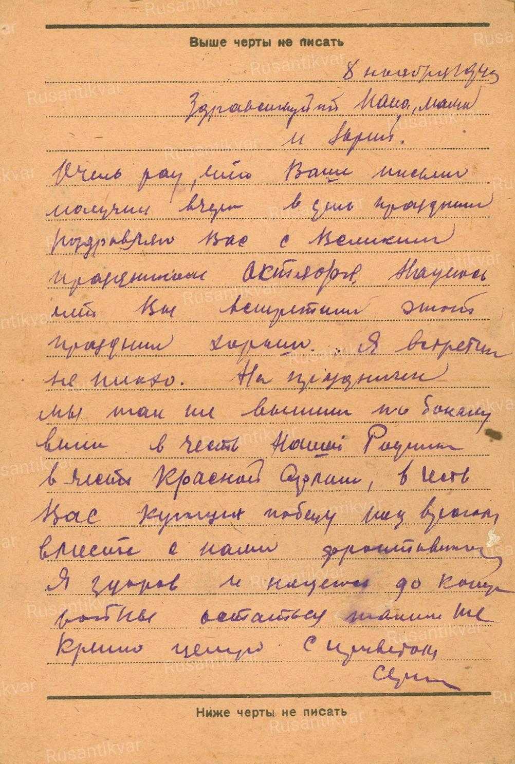 Последнее послание – поздравительная открытка матери Евдокии Александровне от 8 ноября 1943 года: «Поздравляю Вас с Великим праздником Октября. Надеюсь, что вы встретили этот праздник хорошо. Я встретил неплохо. На праздник мы так же выпили по бокалу вина в честь нашей Родины, в честь Красной Армии, в честь Вас, кующих победу против врага вместе с нами фронтовиками. Я здоров и надеюсь до конца войны остаться таким же».