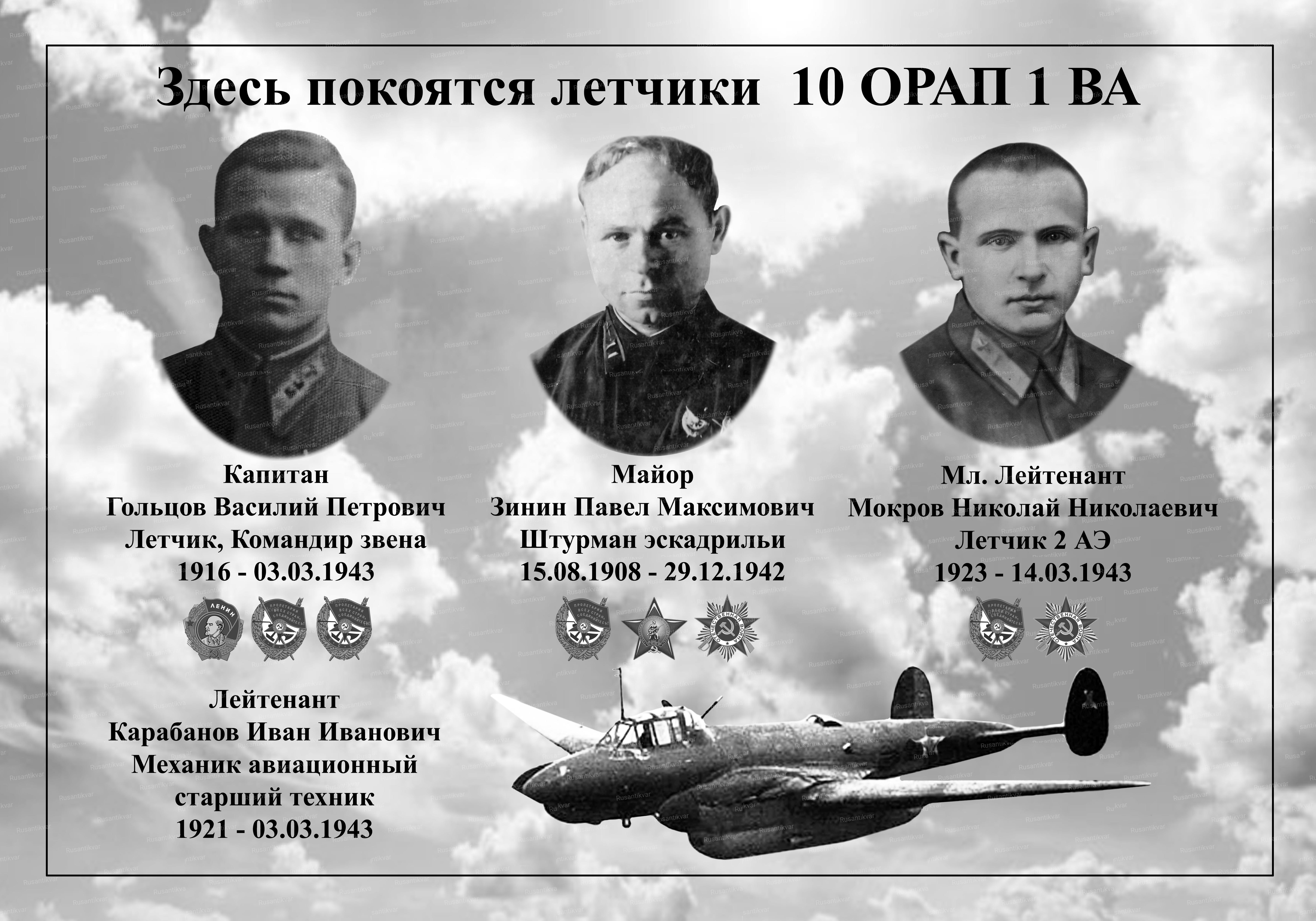 Итак, запись на табличке захоронения гласила: «Летчики Корбанов Иван Иванович, 1921-1943 и Гальцов Василий Петрович, 1910-1942; штурманы Зимин Павел Максимович, 1906-1943 и Макаров Николай Николаевич 1923-1943».
