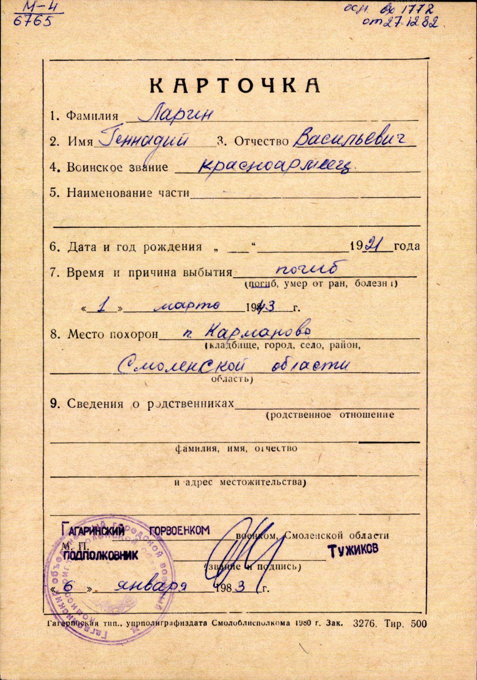 Как оказалось, ещё в 1983 году в Гагаринском военкомате Смоленской области была заведена и тогдашним военкомом подполковником Тужиковым подписана учётная карточка на красноармейца Ларина Геннадия Васильевича, где указано, что он погиб… 1 марта 1943 года, место похорон - п. Карманово Смоленской области. Тужикова нам уже не найти, спросить за такой «учёт» не с кого, да и некому…