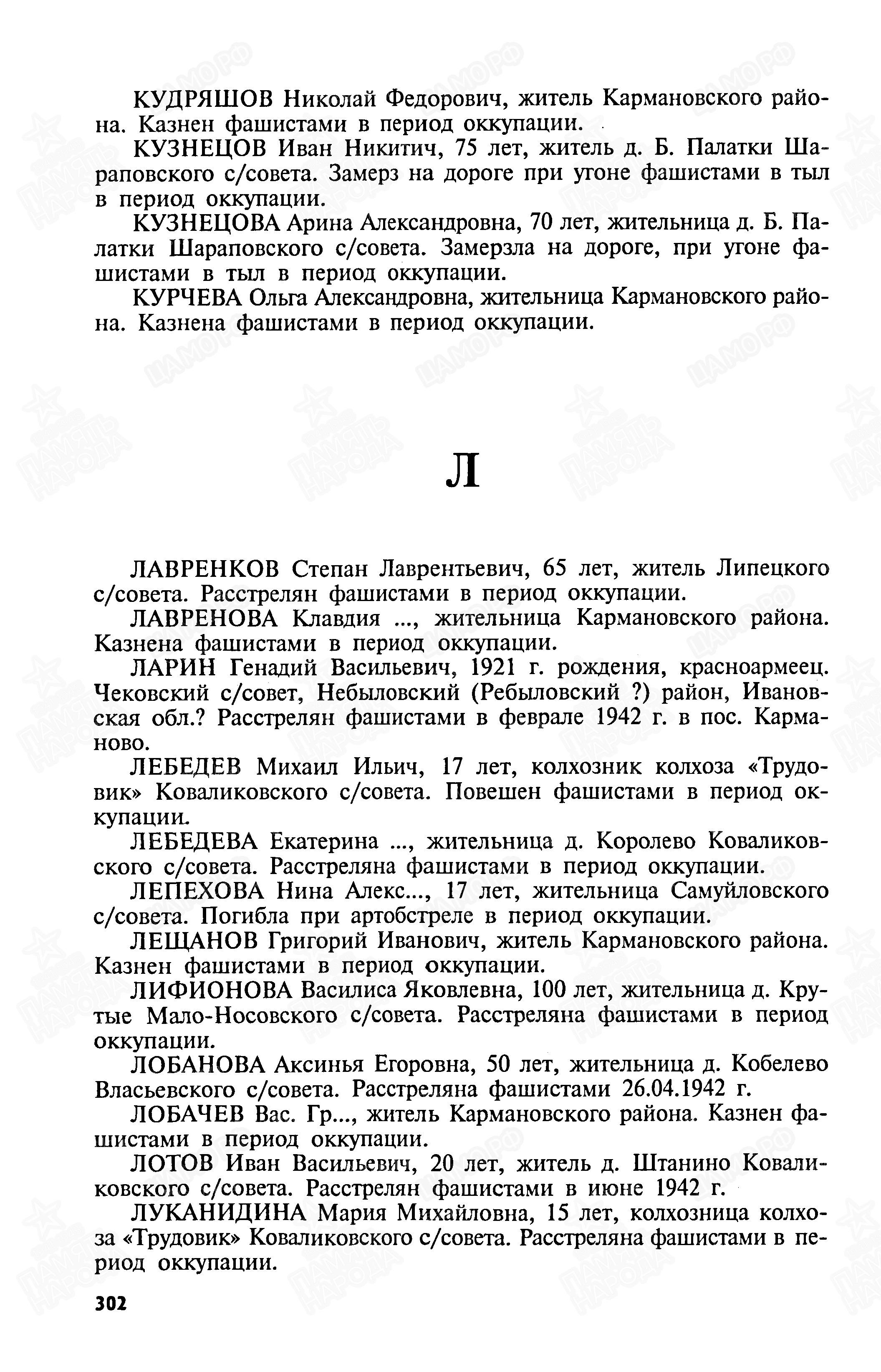 Путем опроса граждан пос. Карманово БУРДИНОЙ А.К., МИХАЙЛОВОЙ Т.М. и других выяснено, что немецкими оккупантами в феврале-марте месяцах 1942 года в пос. Карманово расстреляно более 300 человек советских людей.