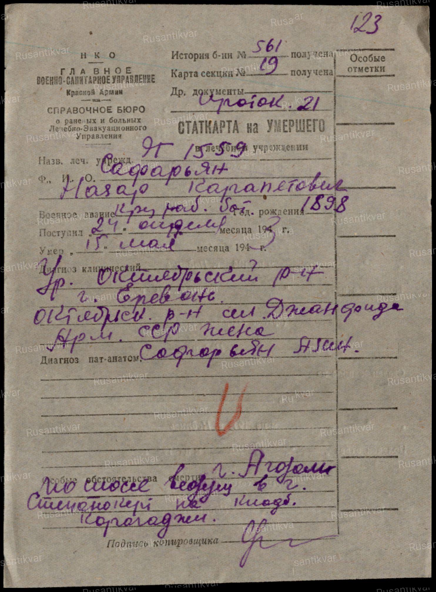 Сафарян Назар Карапетович – красноармеец «раб.бат.», 15.05.1943 умер в госпитале.