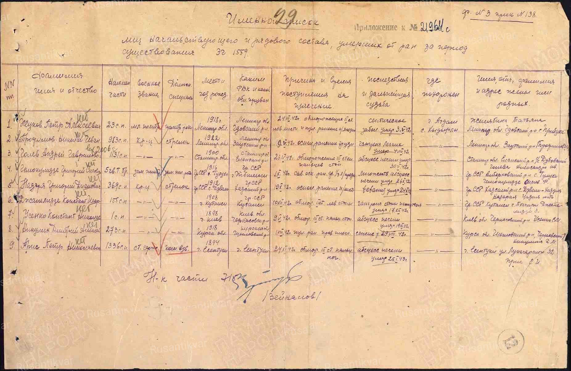 Арис Пётр Николаевич – ст.сержант 1336 сп 314 сд, 25.01.1943 умер в госпитале.