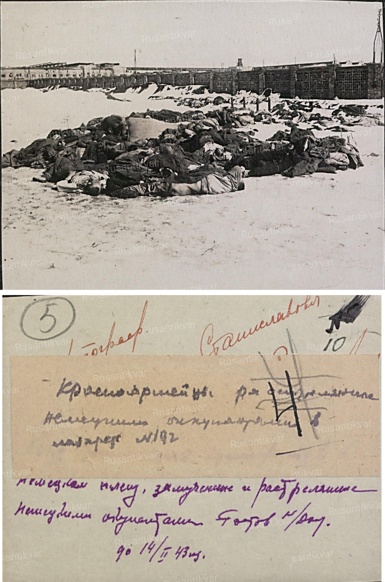 Заместитель председателя Ростовского городского совета депутатов трудящихся Бурменский, посетивший бывший лагерь в первые дни вступления наших войск в Ростов, рассказывал: «…под снегом лежали десятки трупов. Во рву длиною около 200 метров, были наспех зарыты сотни несчастных жертв, ...неподалёку ото рва, прямо на земле, валялись ещё тела 380 замученных и расстрелянных советских граждан. Трупами были наполнены и все щели-бомбоубежища. <…> Когда мы посетили одну из палат так называемого хирургического корпуса, там лежало около 20–25 неубранных трупов, а в «перевязочной» на столе мы увидели уже успевший разложиться труп неизвестного красноармейца. К моменту прихода Красной Армии в Ростов в лагере оставалось в живых всего лишь несколько сот человек. Остальные погибли. <…> Специальная комиссия зафиксировала неслыханные злодеяния германских фашистов над советскими военнопленными».