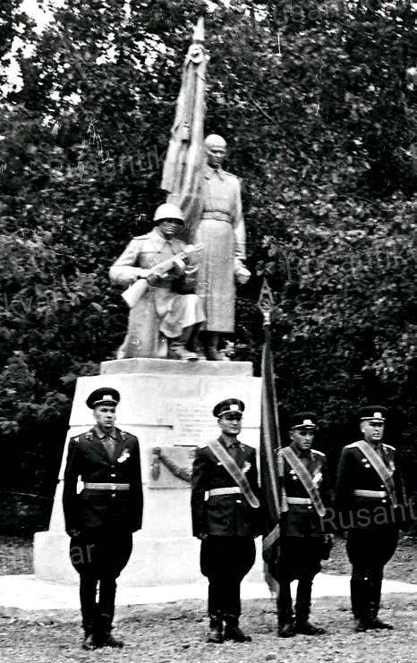 Впоследствии этот памятник заменили на типовой, большего размера – «два солдата со знаменем».
