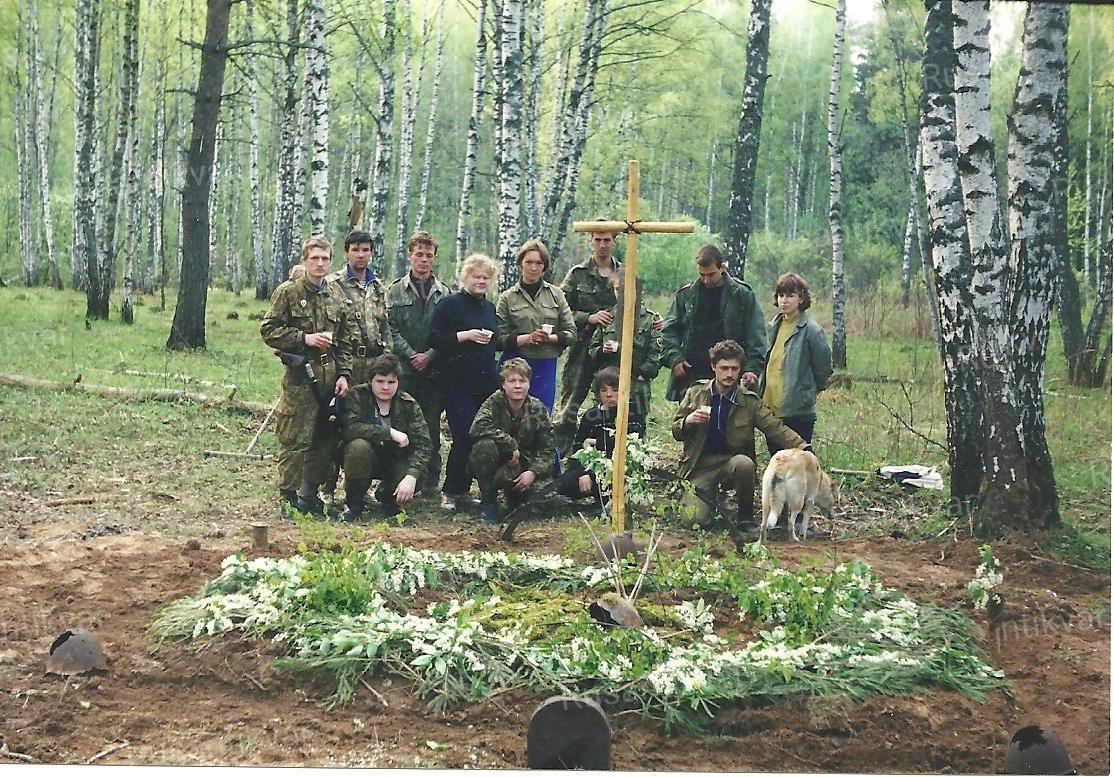 2. Поисковики «Обелиска» у братской могилы, 1994 г.