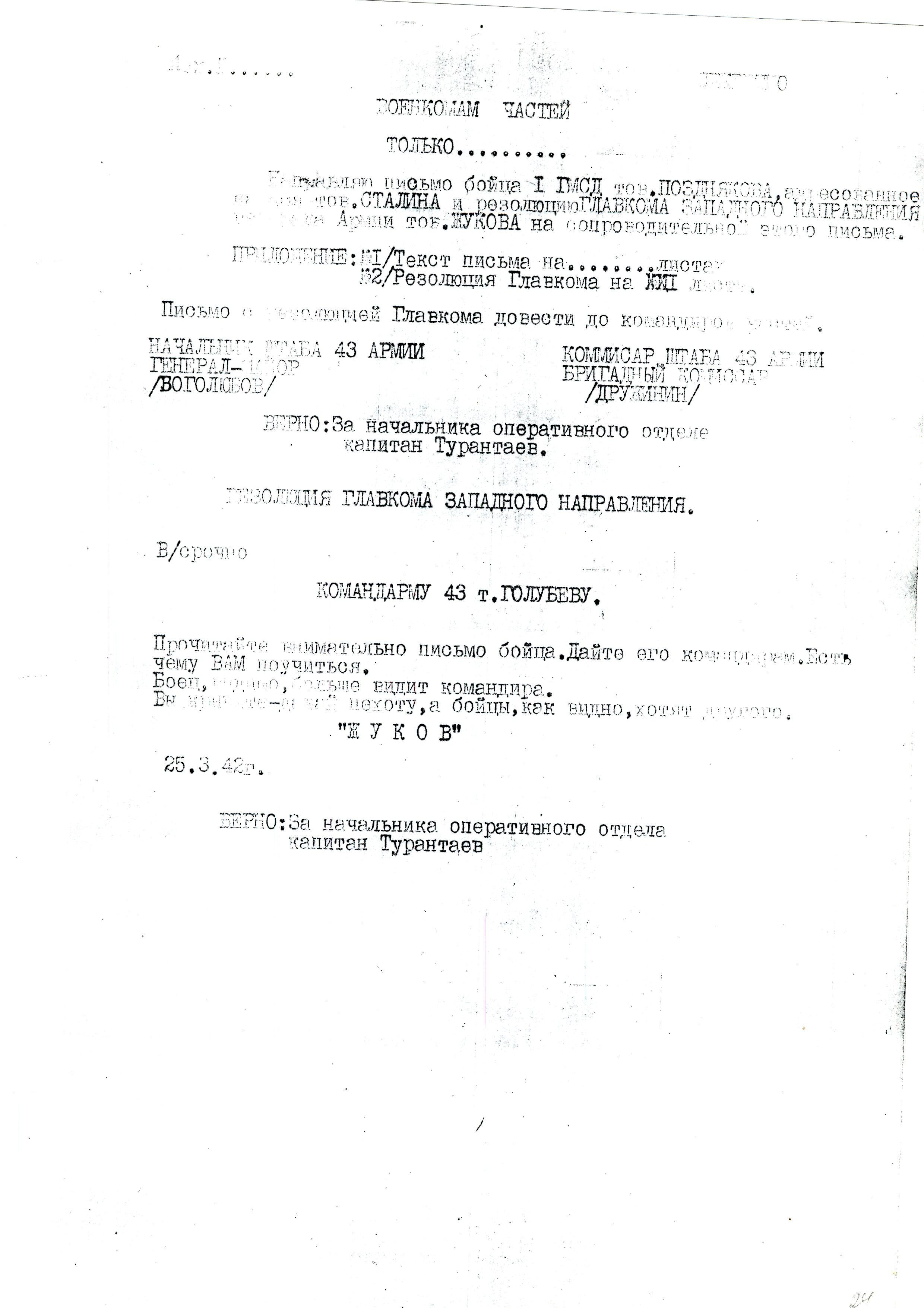 Направляю письмо бойца I ГМСД тов.ПОЗДНЯКОВА, адресованное на имя тов.СТАЛИНА и резолюцию ГЛАВКОМА ЗАПАДНОГО НАПРАВЛЕНИЯ генерала Армии тов.ЖУКОВА на сопроводительной этого письма