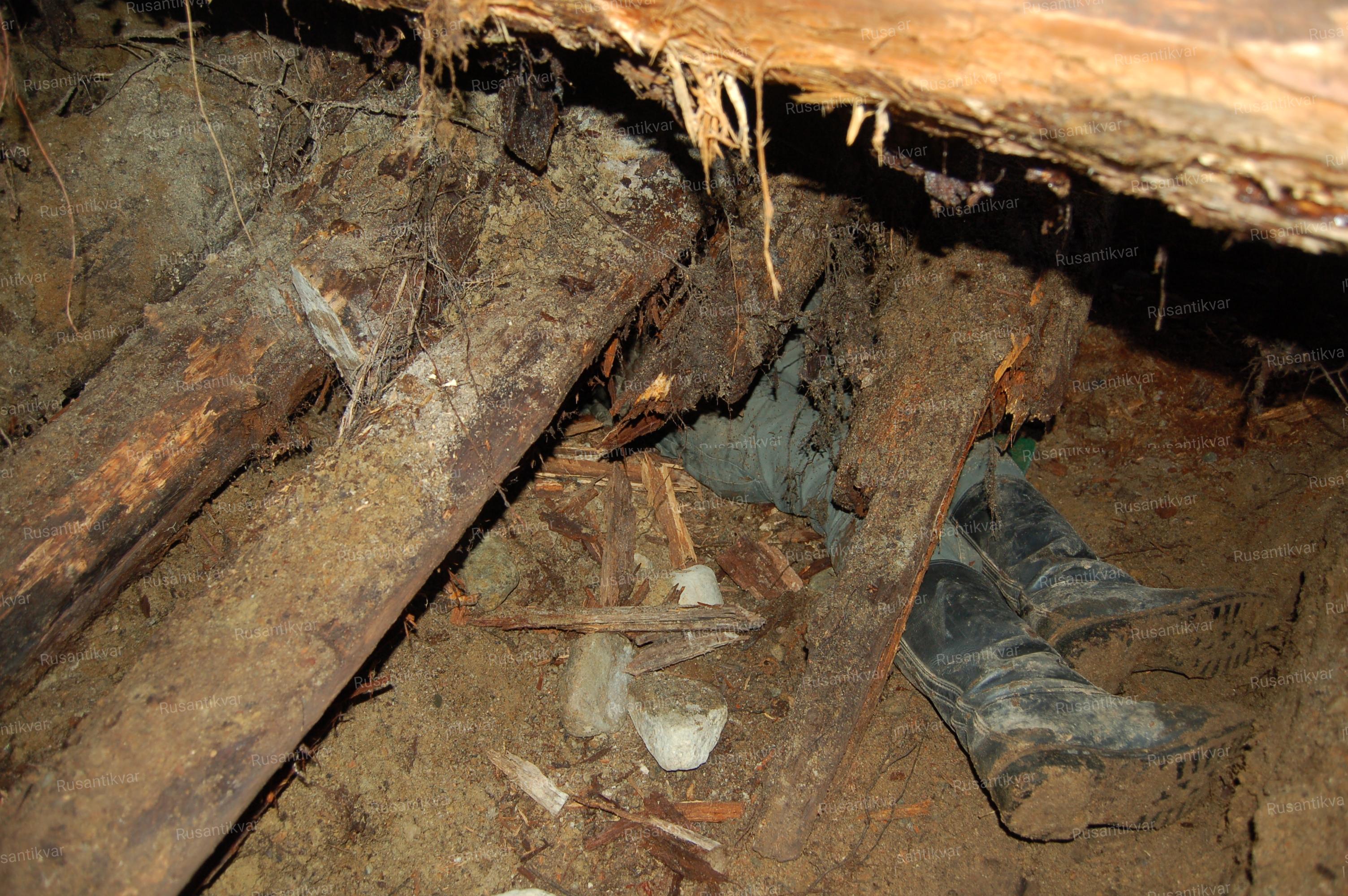 На разведку окрестностей оставался максимум день и наутро поиск продолжился в прежнем направлении: благо, форсировав болото, мы нашли за ним продолжение вчерашней дороги. По обочинам ее довольно скоро обнаружились остатки бревенчатых строений и блиндажи. Практически все они были вскрыты еще много лет назад, однако попадались и совсем свежие раскопки. Отметились и мы, поработав над «норой» примерно три на три метра с полусгнившим, но еще целым накатом и проступавшей сквозь трехуровневый жердяной настил пола водой. Наградой за трехчасовые (цифра «три» нас прямо-таки преследует) усилия стала… саперная лопатка. Сохранилась вполне прилично, даже черенок деревянный почти цел.