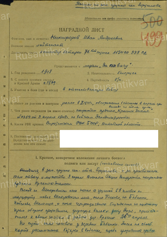 Наградной лист на вышедшего из окружения лейтенанта 1134 СП 338 СД Никифорова Ивана Андреевича.