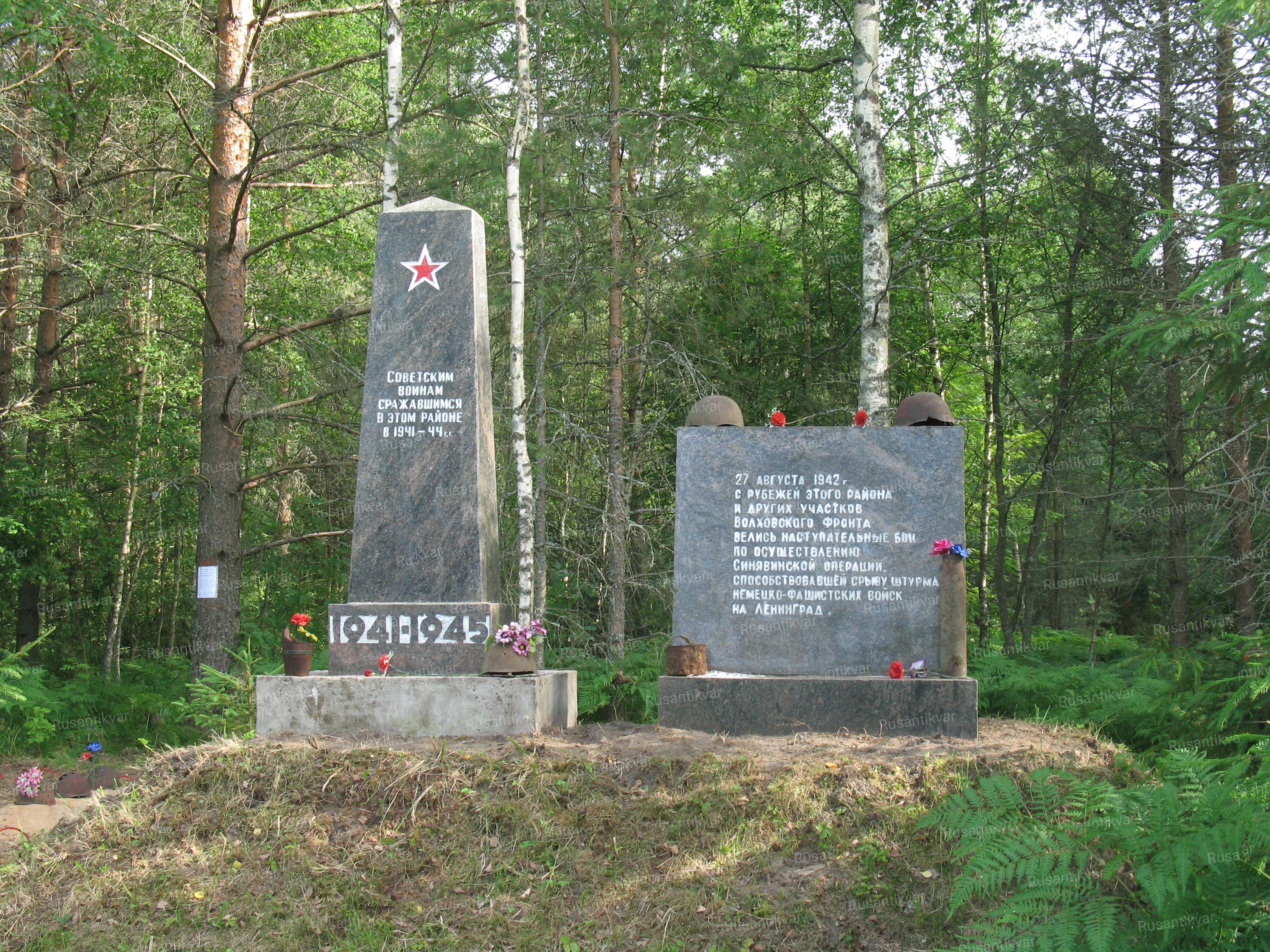 10) Гранитный типовой знак, посвященный Синявинской наступательной операции (27.8 — 10.10.1942 г.) и братское захоронение.