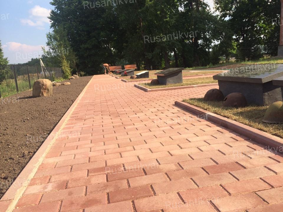 Основание кладбища – это песочно-щебеночная подушка, на которой сделана армированная металлической сеткой бетонная стяжка, вымощенная бордовой тротуарной плиткой и окантованная бордюрами.