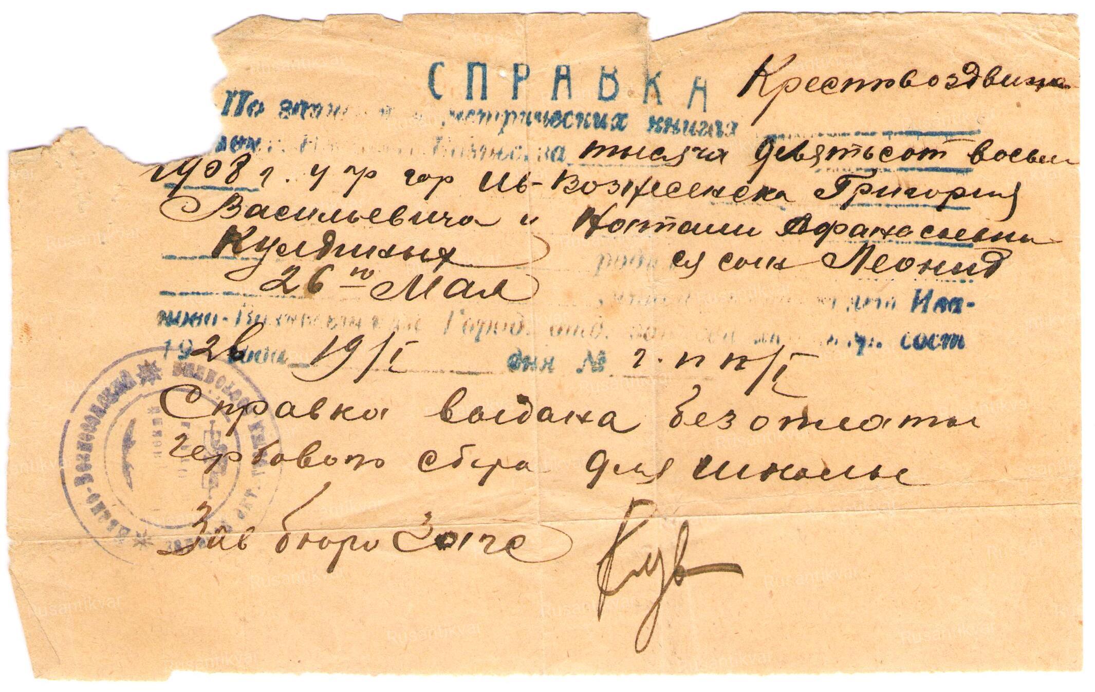 3. Справка о рождении Леонида Кулдина, 1926 год.