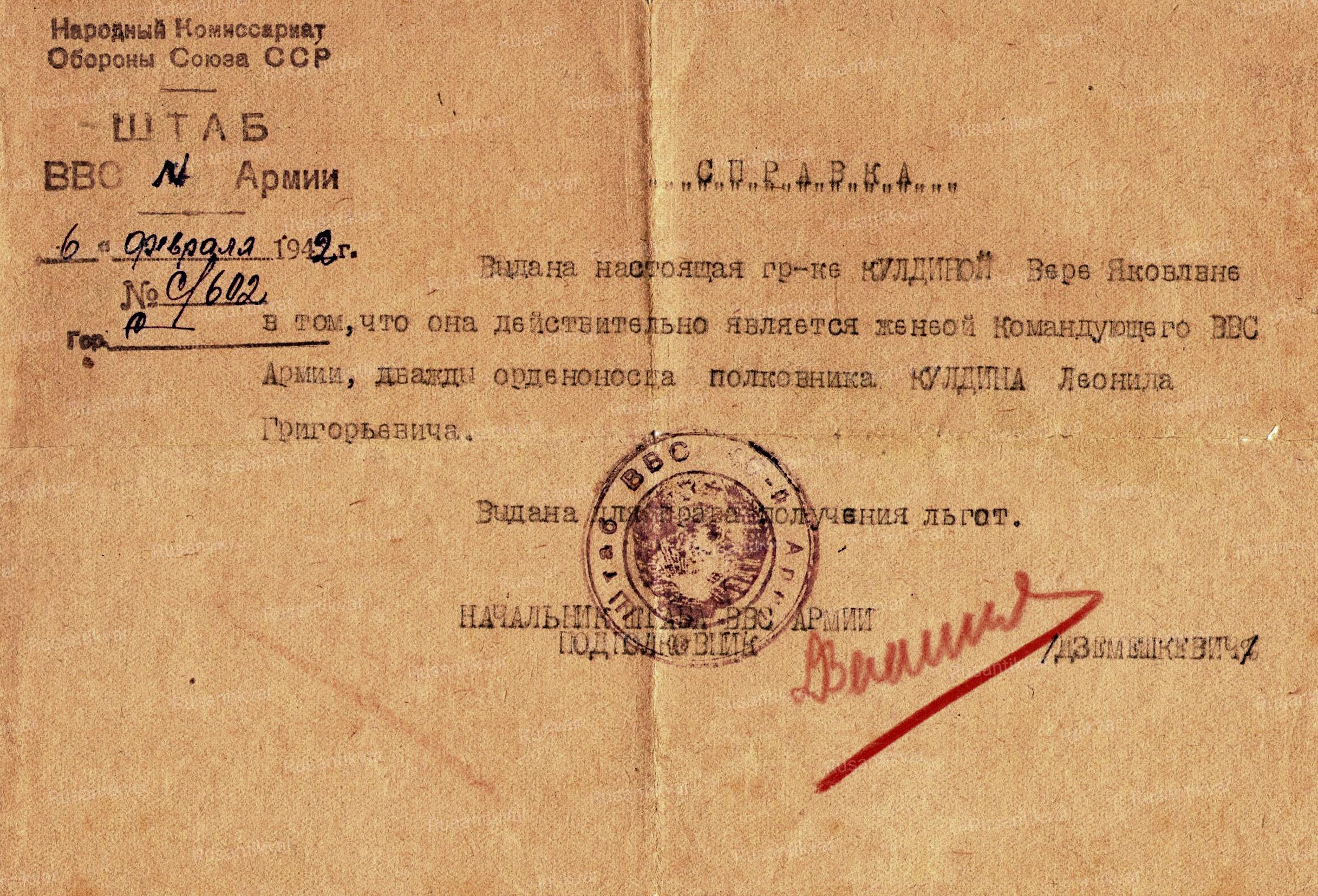 8. Справка о гибели полковника Кулдина, 1942 год.