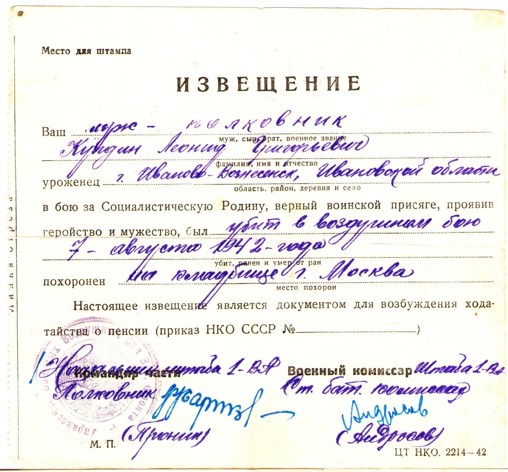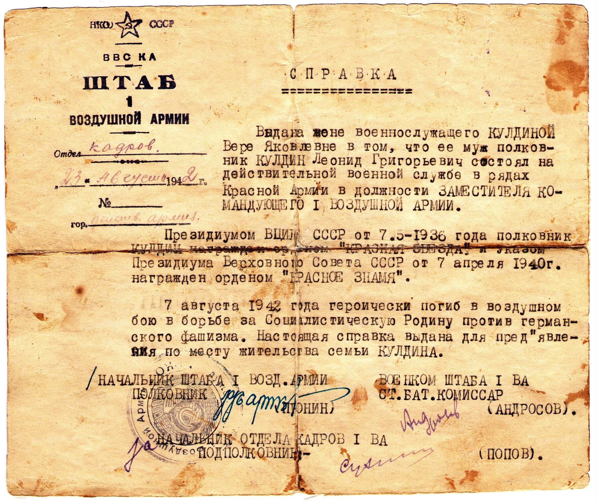 Среди документов управления ВВС 1-й ВА Западного фронта хранится извещение о гибели, в просторечии - «похоронка». Скупым казённым языком в ней указано: «Ваш муж, полковник Кулдин Леонид Григорьевич, уроженец г. Иваново-Вознесенск Ивановской обл. в бою за Социалистическую Родину, верный воинской присяге, проявив геройство и мужество, был убит в воздушном бою 7 августа 1942г. Похоронен на кладбище г. Москва» . Извещение адресовано жене – Вере Яковлевне Кулдиной, проживающей в Ленинграде по адресу: ул. Перовской, д.4/2, кв.137. В пункте 8 «Где похоронен» повторно указывалось – г. Москва . Эта пометка вызывала вопросы – действительно ли тело полковника было найдено и перевезено в Москву или захоронение прошло только «на бумаге», как нередко случалось во время боевых действий. Пока что мы не знали ответа.