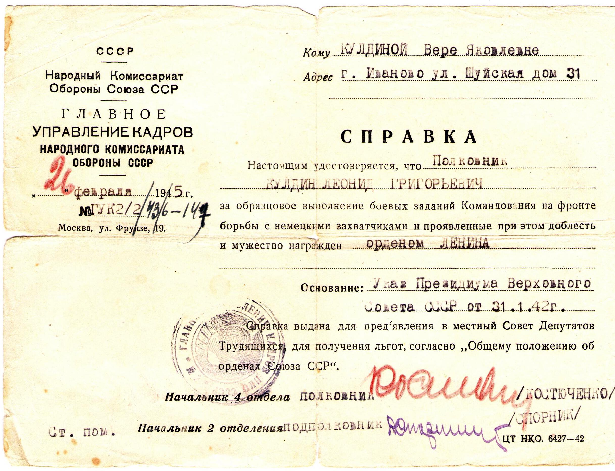 9. Справка о награждении Л.Г. Кулдина орденом Ленина, 1945 год.