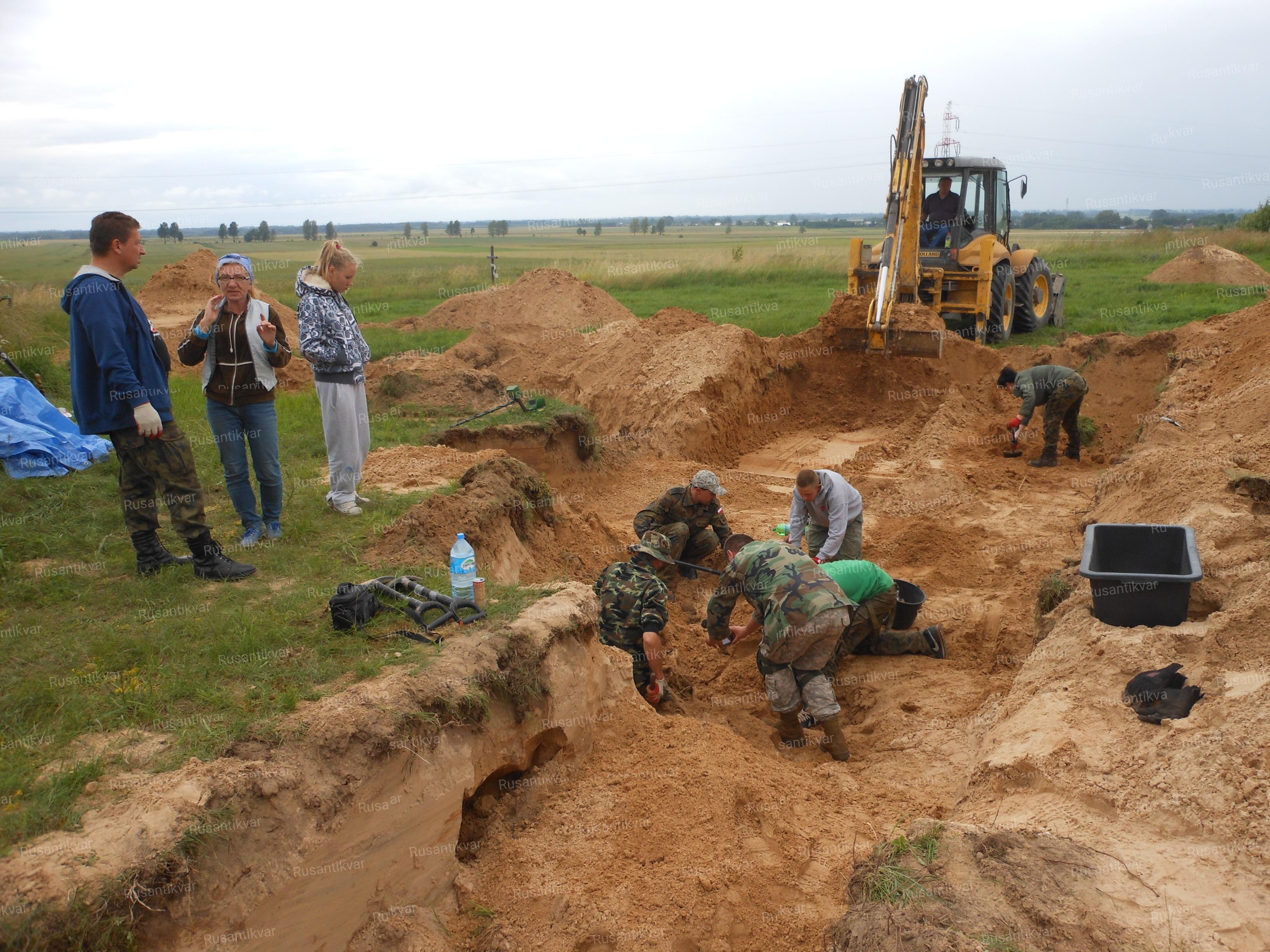 Утром прибыл экскаватор. Мы огородили территорию и начали вскрывать грунт у крестов, там, где показал Ваврещук. Пётр ошибся только на пару метров и вот уже в одной из следующих траншей показались костные останки, сначала фрагменты, но чем глубже, тем более полные скелеты людей. А экскаватор вскрывал грунт дальше, воронок и ям было очень много, какие-то были вообще пустыми, в других попадалось очень много костей животных. Ну и, конечно же, мусор. Мусор был практически везде. Тем временем ребята проверили еще одно место, которое указал Пётр Ваврещук, но, к сожалению, опять обнаружили только кости животных. Ближе к обеду к нам на помощь из Минска приехал наш давний приятель по работе с поисковой группой «Рейд» Виталий Ярмолович.