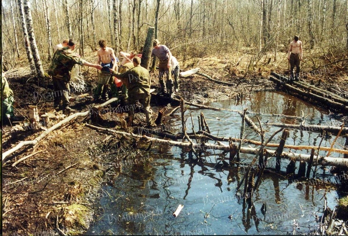 Наконец лес огласился шумом машин и радостным гомоном. Приехали остальные поисковики. Радуясь весне и длинным выходным в лесу, вдали от ставшей за долгую зиму постылой работы оживлённо общаясь друг с другом, ставили палатки и разводили костры. И со следующего дня на яме началась активная работа. На помощь приходили разные ребята из нашего объединения, вместе с Анатолием в болото спустились работать даже ребята из г. Владивостока, моряки одного из стоящих сейчас во Франции вертолетоносцев «Мистралей». Каждое утро начиналось с проверки шлангов, заправки топливом и запуска помпы для откачки ямы за ночь до краёв наполнившейся водой. Это было очень похоже на «день сурка». Но каждый день воронка становилась всё шире. За неделю работ она увеличилась почти в два раза.