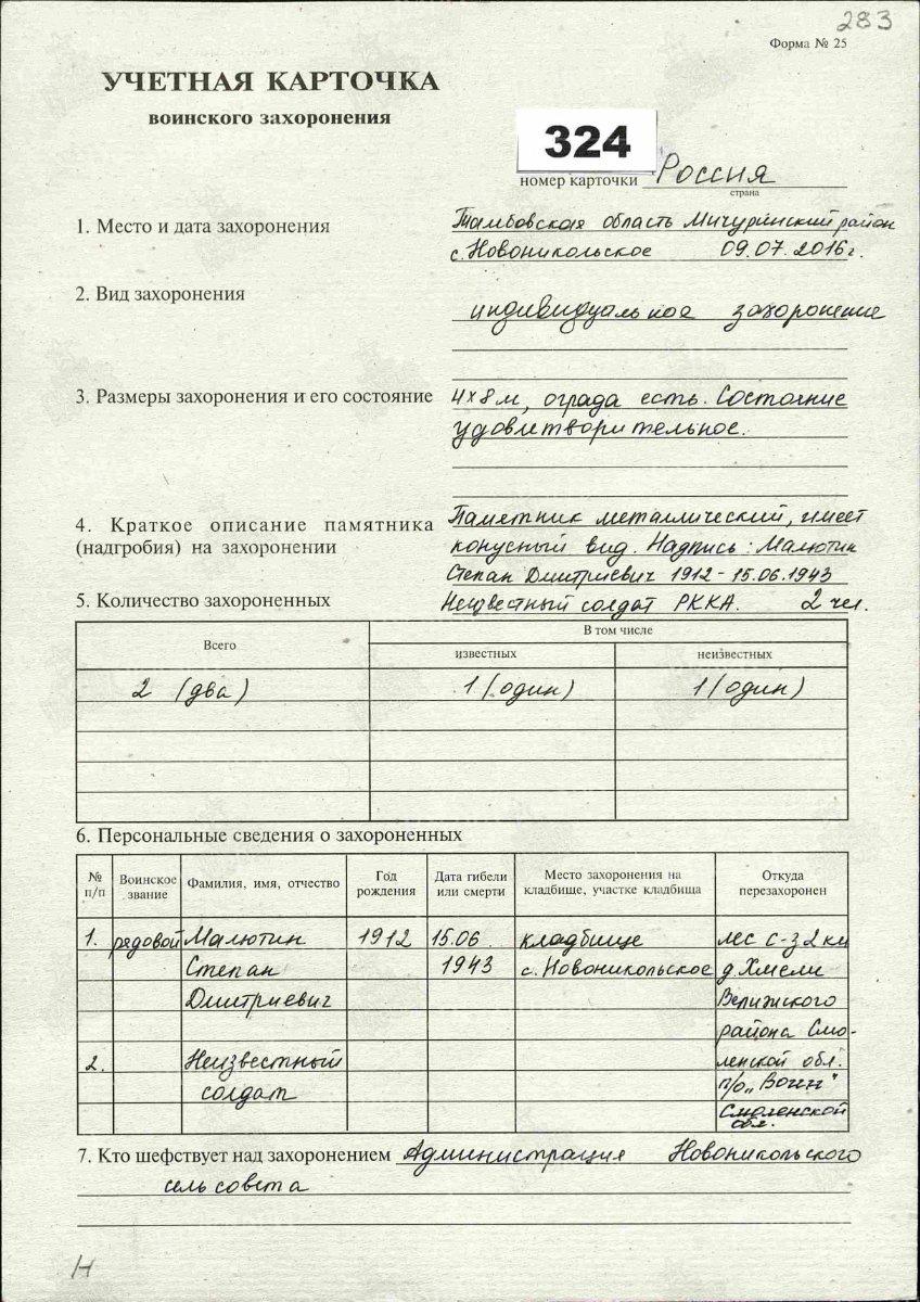 Учётная карточка воинского захоронения. Малютин С.Д.+ 1 неизвестный воин.