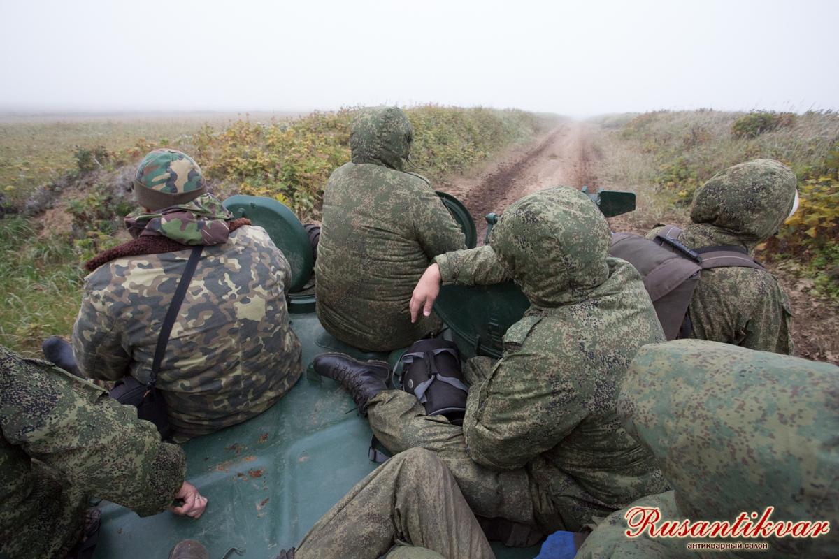 Ранним утром 6 сентября заспанные люди с рюкзаками и баулами подтягивались к зданию МО в центре города. Несмотря на довольно большую группу, в служебный автобус влезли все: съёмочная группа ВГТРК – примерно 10 человек с серьезной аппаратурой, несколько военных и мы. Были запланированы съёмки документального фильма о последнем сражении Второй мировой – десанте на Шумшу в августе 1945-го. Надо сказать, что вся группа РГО, подготовленная для экспедиции, состояла из пяти человек вместе со мной. Я, разумеется, – за старшего. Команду подобрал не большую, но квалифицированную. Сразу, для краткости и точности радиообмена, договорились о позывных. Фотограф и историк военного костюма Андрей - «Стрелок». Мастер по реставрации авто- и бронетехники Юрий Иванович - «Юриваныч». Специалист по картографии и навигации Сергей - «Дед». Страстный любитель и знаток бронетанковой техники Андрей - «Енот». Ну, и я – человек о специальной подготовке и исторических познаниях которого трудно сказать что-то определенное, потому и начальник! Позывной – совершенно не отражающий тягу к общению и любовь к компаниям – «Хутор».