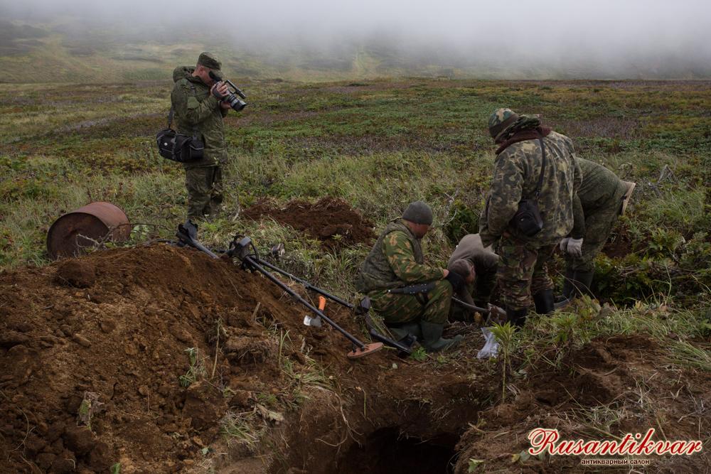 Новичков на острове не было. Каждый знал свое дело, профессионально им занимался, никому не мешал. Думаю, если бы можно было взглянуть на участников экспедиции с высоты птичьего полета, то вряд ли был бы заметен хоть один праздно шатающийся человек. У подножья высоты 171 с мемориалом памяти павшим воинам поисковики находят в траншеях солдат, с другой стороны высоты - «РГО-шники» осматривают и составляют отчёты о состоянии японской бронетехники, вокруг всего этого делового муравейника располагаются ребята из съёмочной группы, «документирующие», по сути, историческую экспедицию, а в нескольких километрах от них военные охраняют от аборигенов-медведей лагерь, готовят нам вкусный обед и поддерживают работу бензогенераторов, чтобы вечером у нас был свет и заряжались многочисленные аккумуляторы съёмочного и поискового оборудования.