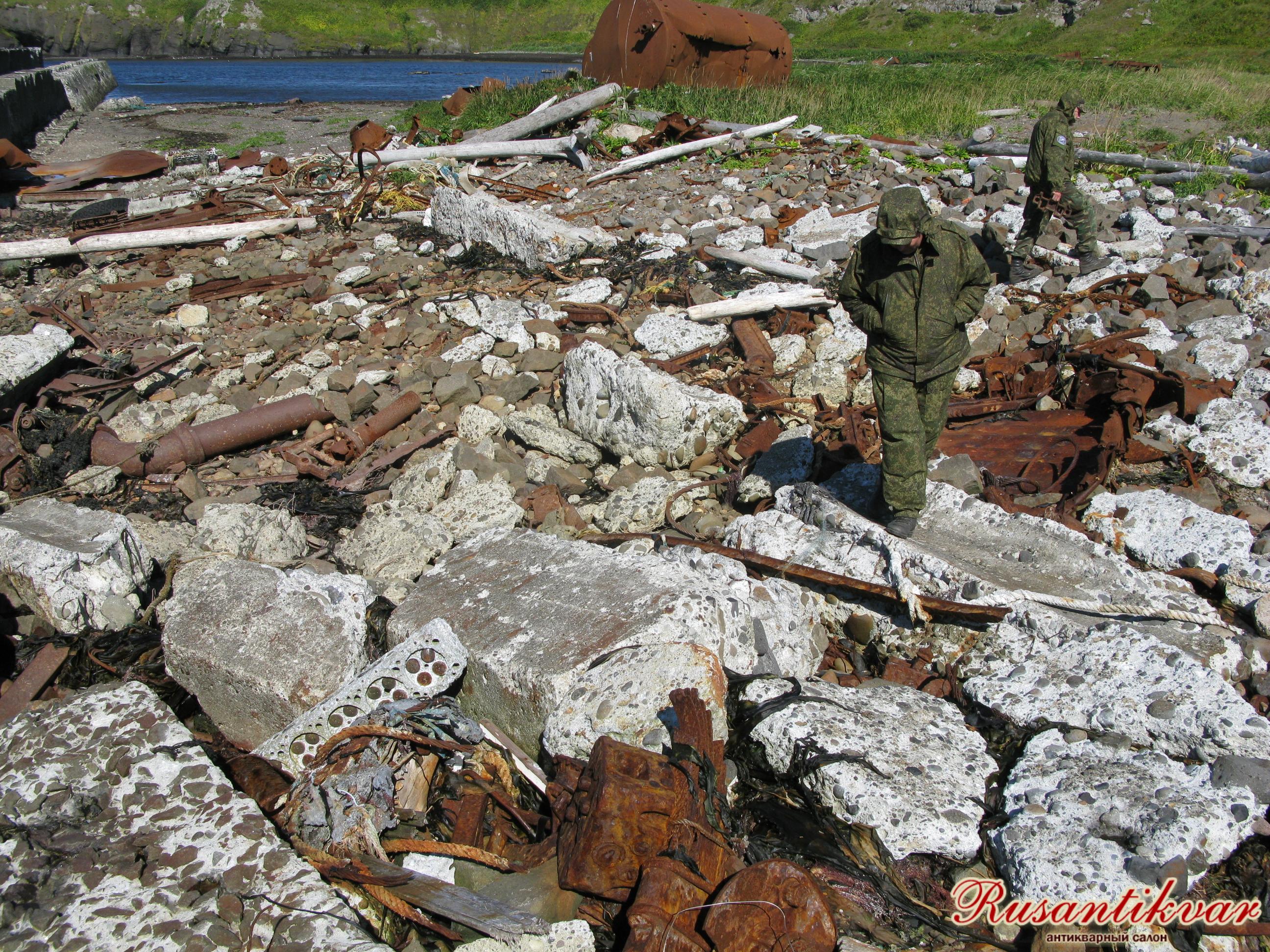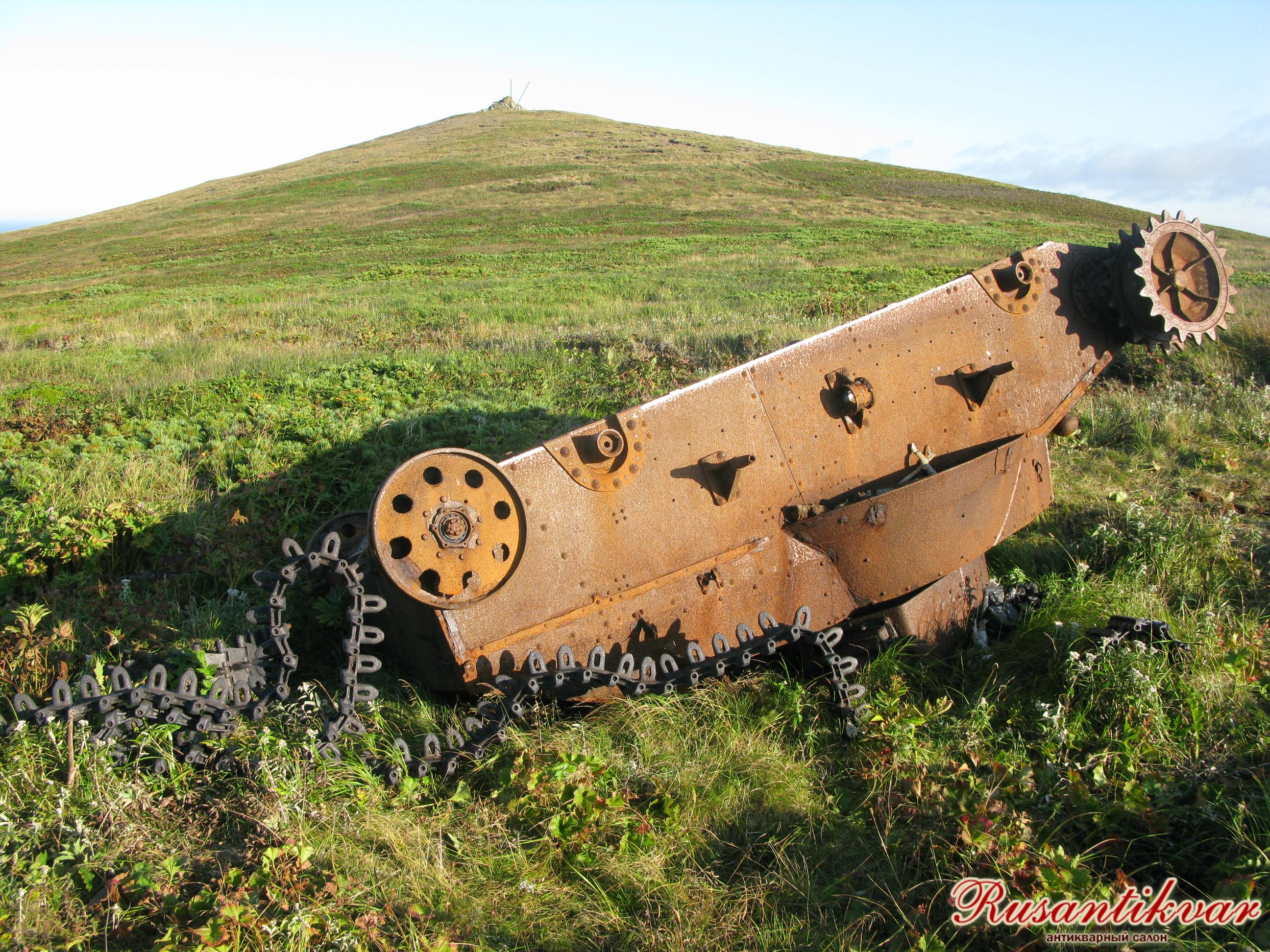Берег – сплошное наслоение ржавого железа. Чего там только нет. И катки от танков, и «гусянка», и «полуторошные» колеса на балке – остатки прицепа. Всё – жутко гнилое. Климат здесь суров не только к людям, но, в первую очередь, «пожирает» сталь и цветные металлы. В осмотренных нами танках моторы выглядят, как обмылки у дачного умывальника. Просто бесформенные куски белого цвета, которые уже давно начали крошиться и слоиться.