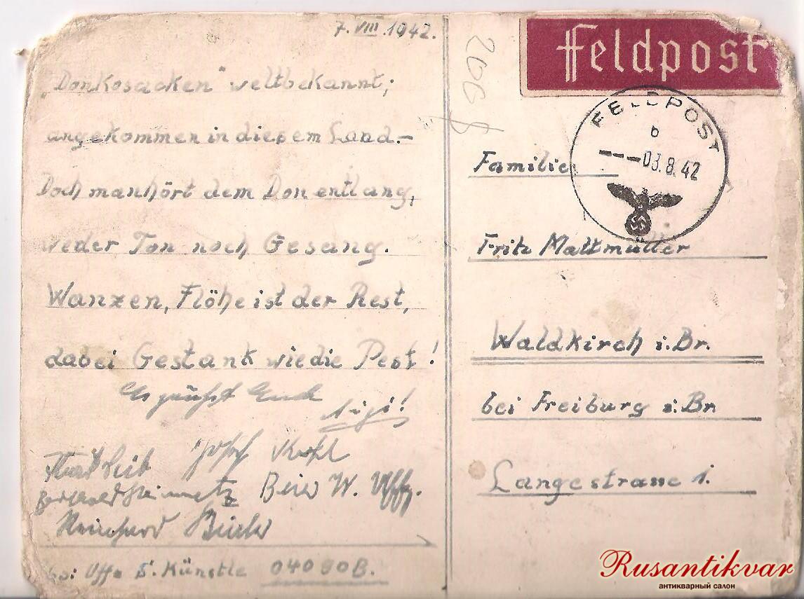 Фото кубанских казаков Кавказского полка,немец использовал в качестве почтовой открытки и в стихотворной форме написал следующее:"Приехал к донским казакам,а вместо плясок и песен нашёл клопов,блох и вонь как во время чумы".Окупант,погостить приехал...