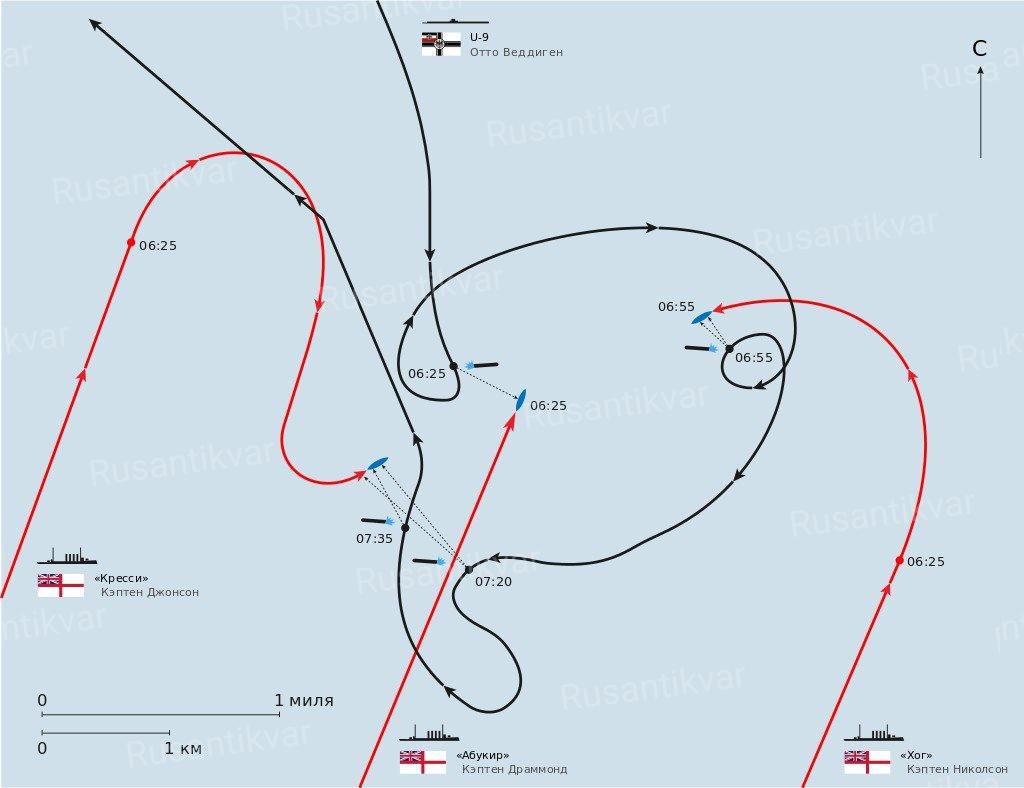 «...эта крупная победа германских подводников объясняется исключительно неверной тактикой англичан, грубыми просчетами штабов и психологией человека XIX века... Офицеры королевского флота всегда встречают врага лицом к лицу. Они просто не могут допустить возможность подлого удара в спину, поэтому командиры потопленных английских крейсеров не приняли элементарных мер защиты от немецких торпед. Когда тонул торпедированный первым «Абукир», командиры «Хога» и «Кресси» должны были немедленно покинуть опасный район, но лорды Адмиралтейства не дали им соответствующих инструкций, а честь и законопослушность не позволили бросить попавших в беду товарищей. «Хог» и «Кресси» застопорили машины и принялись спасать тонущих матросов «Абукира». Тем самым они подставили себя под торпеды U-9.»
