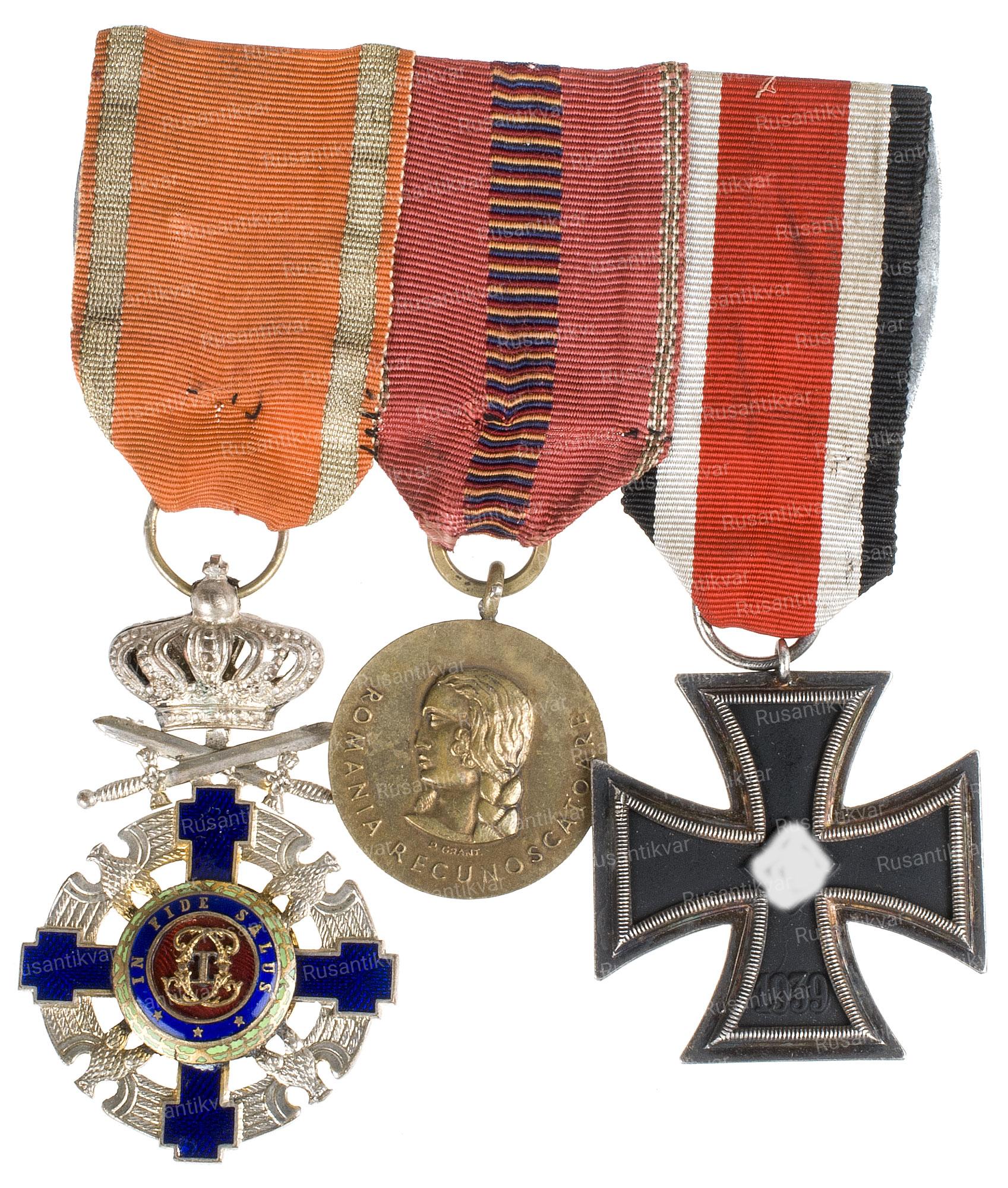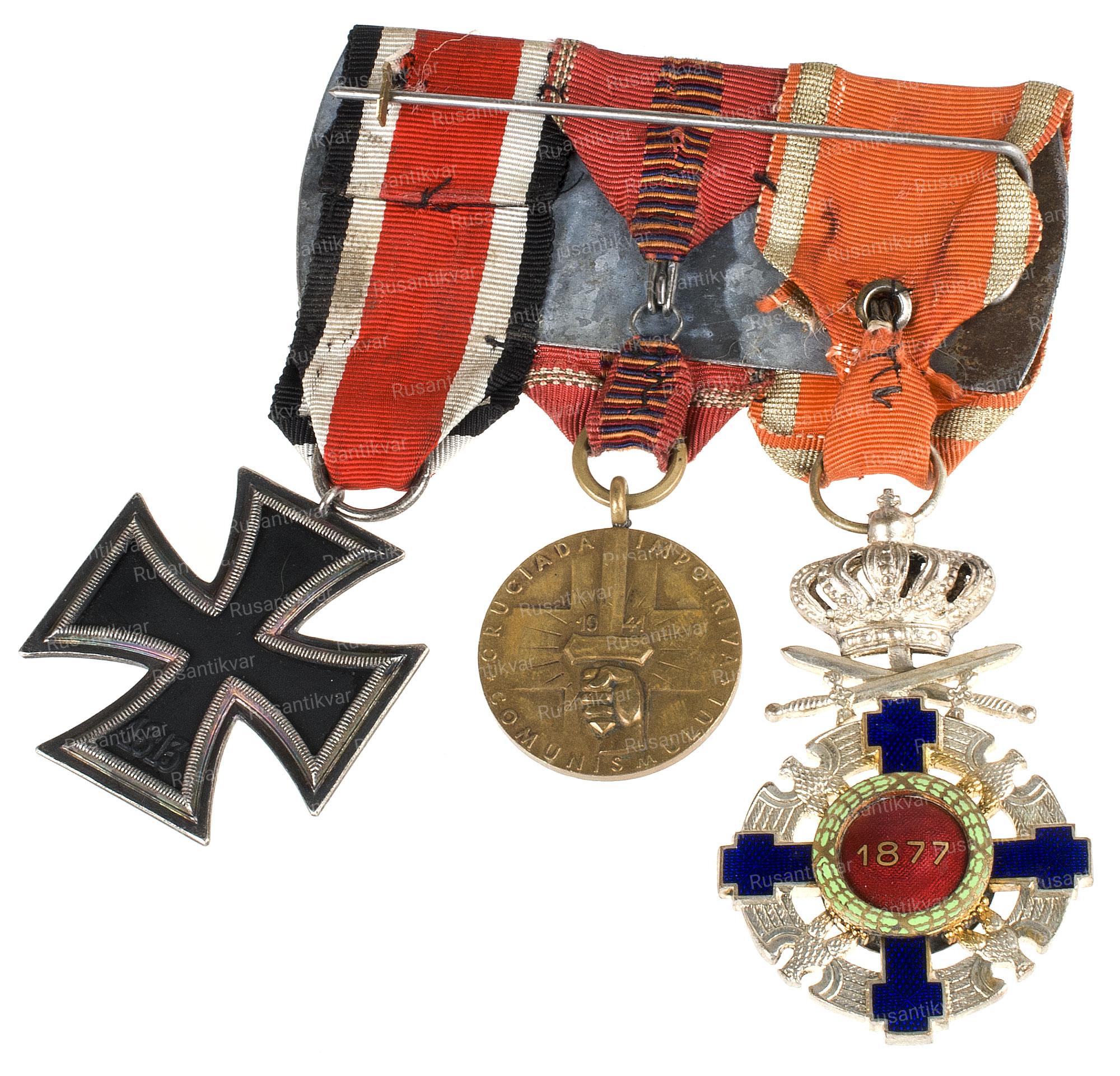 Колодка румынского офицера.На первом месте расположен орден звёзды Румынии с мечами( Высшая награда Румынии ),зачастую очень часто вручавшийся немецким офицерам.Далее медаль за крестовый поход против коммунизма (года вручения 1942-44) широко вручавшаяся с разными планками ( мест боев) военнослужащим Румынских, Итальянских,Словацких, Немецких частей.И 3 по счету представлен железный крест 2 класса 3-Рейха , наиболее почетная награда 2 мировой, для немецких военнослужащих и сателлитов Германии.