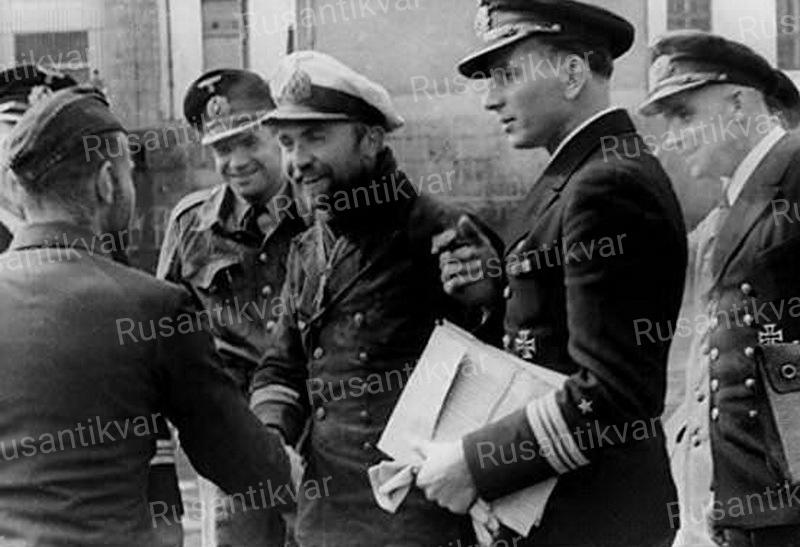 Командир "семёрки" U-47, знаменитый "Бык Скапа-Флоу", Гюнтер Прин с чувством пожимает руку командиру маленькой "двойки" U-138 Вольфгангу Люту. Рядом стоит командир "семёрки" U-99 Отто Кречмер ("Молчаливый Отто"), а за ним командир "двойки" U-59 Йоахим Мац.