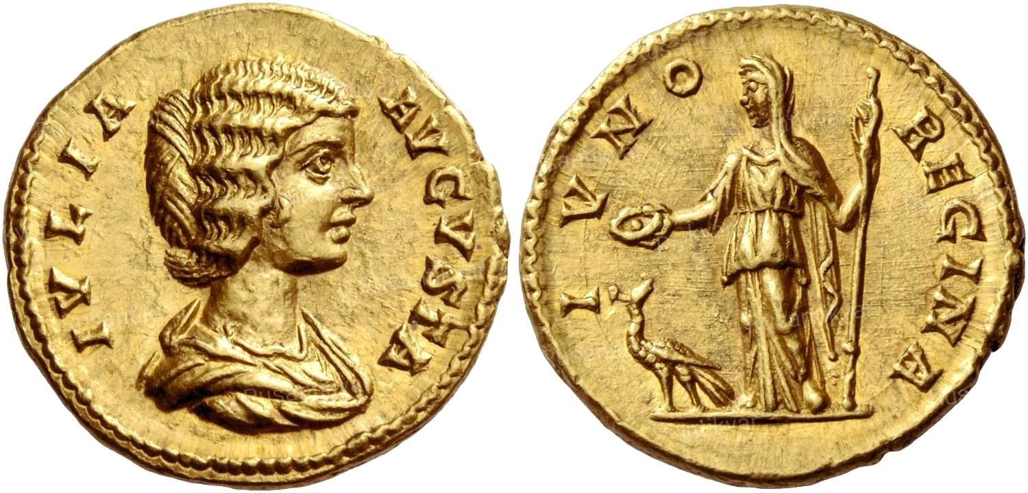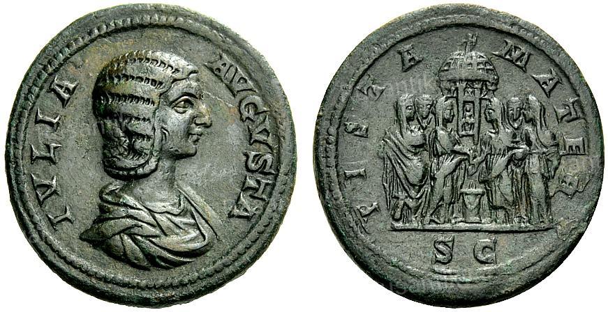 АВЕРС: IVLIA AVGVSTA — драпированный бюст Юлии Домны вправо; волосы искусно уложены шестью волнами и собраны на затылке в большой узел (шиньон).