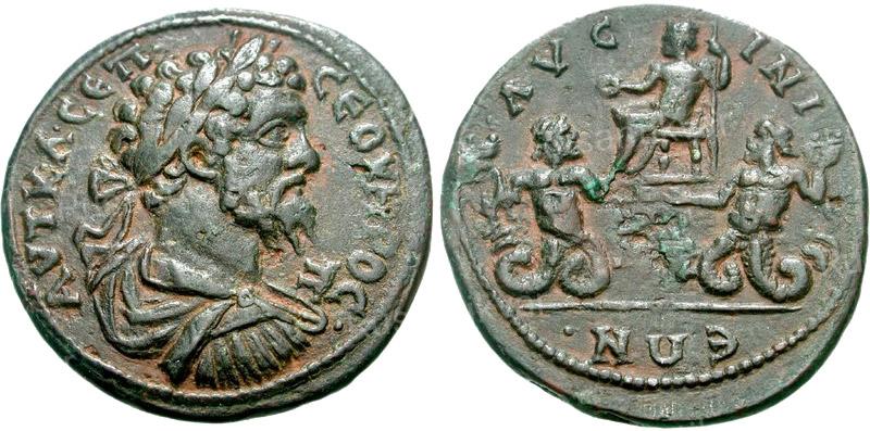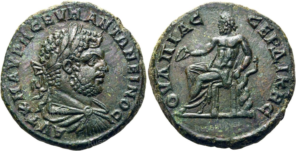 АВЕРС: ΑΥΤ. Κ. Λ. ϹΕΠ. ϹΕΟΥΗΡΟϹ Π. — драпированный бюст Септимия Севера в доспехах и в лавровом венке вправо.