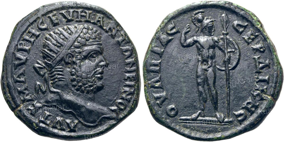 АВЕРС: ΑΥΤ. Κ. Μ. ΑΥΡΗ. ϹΕΒΗ. ΑΝΤΩΝΕΙΝΟϹ — драпированный бюст Каракаллы в доспехах и в лавровом венке вправо.