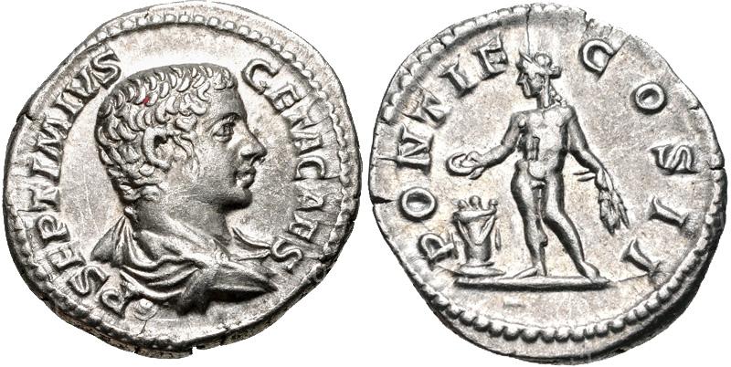 Денарий, ок. 208 г. титул на аверсе — CAES, на реверсе — PONT COS II (понтифик; консул, 2-й срок полномочий)