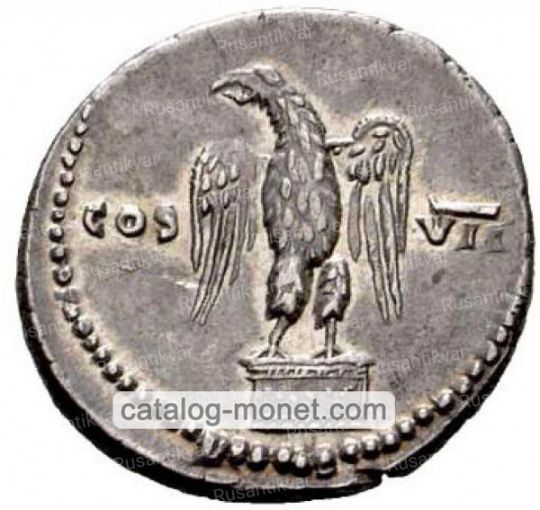 CAESAR AVG. F. DOMITIANVS COS. VI — голова Домициана в лавровом венке вправо.