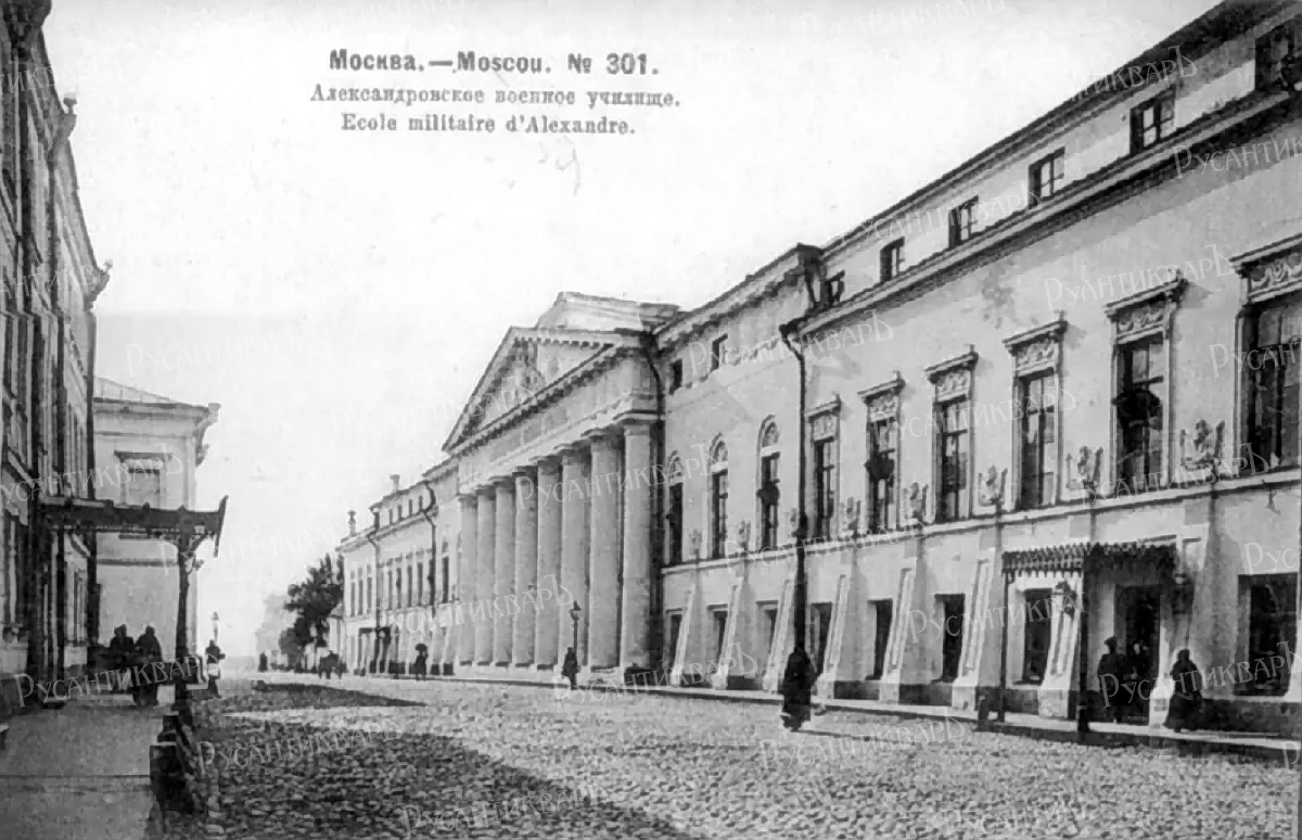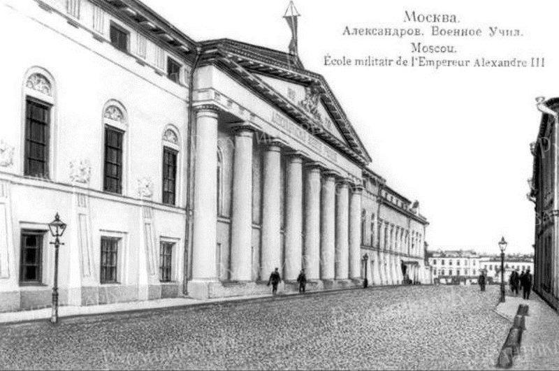 Здание училища в Москве было построено в 1792 году известным архитектором Ф. И. Кампорези в формах раннего классицизма. Первоначально оно принадлежало графам Апраксиным.Это высокое здание с колоннадой и лепным пеликаном, кормящим своих птенцов, - на углу Арбатской площади и улицы Знаменка. Сейчас комплекс Александровского училища занят Министерством обороны РФ.