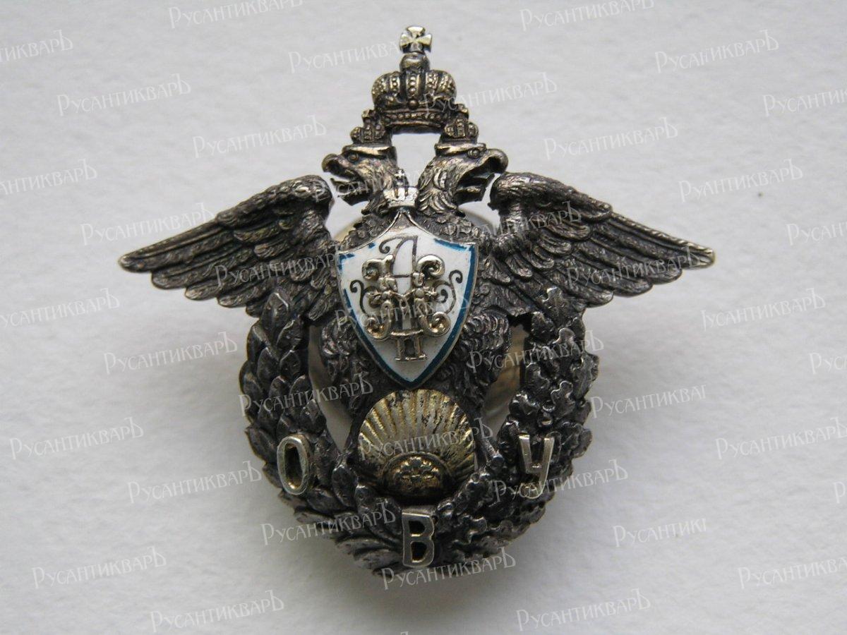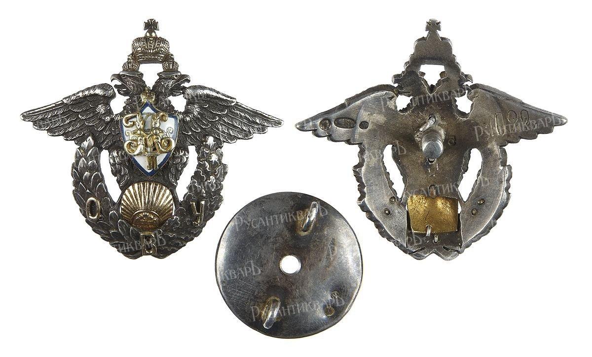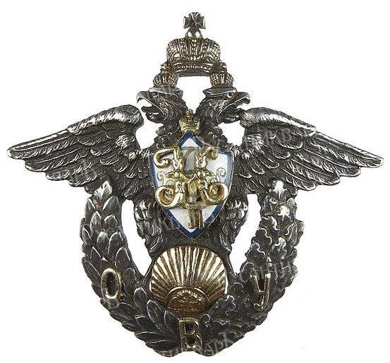 Серебряный оксидированный двуглавый орел с тремя золотыми императорскими коронами, опирающийся на серебряный же полувенок из лавровых и дубовых ветвей, на котором три золотых буквы: «ОВУ», а на груди орла белый эмалевый щиток с синим кантом, увенчанный золотой короной. На нем вензель Императора Александра II, а по нему накладной вензель Императора Николая II. Под лапами орла золотой герб военно-учебных заведений.