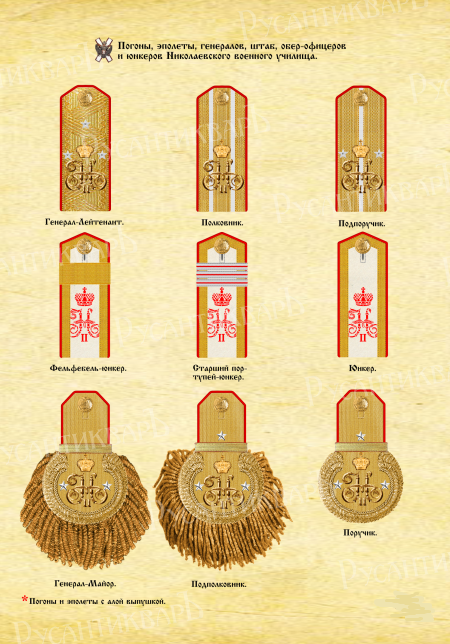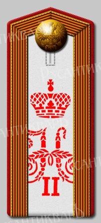 Юнкера этого училища носили белые погоны с алой выпушкой и алым трафаретным вензелем императора Николая II ( «НІІ») и с золотым накладным вензелем в роте Его Величества.