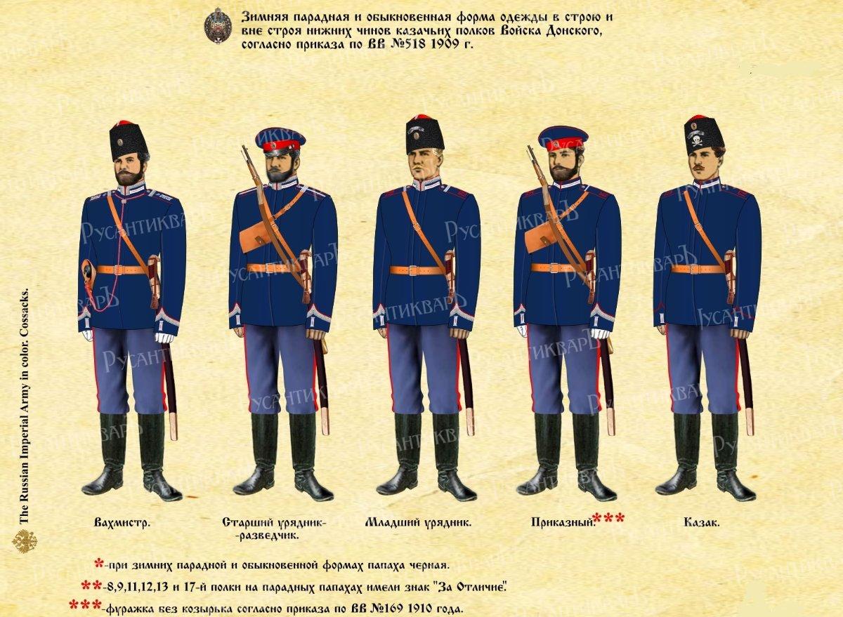 Новочеркасское и Оренбургское казачьи училища до 1903 г. не имели единой формы одежды. Каждый юнкер носил форму своего войска. От казаков и урядников строевых частей их отличал только галун по свободным краям погона. Форма юнкеров Новочеркасского казачьего училища менялась несколько раз.