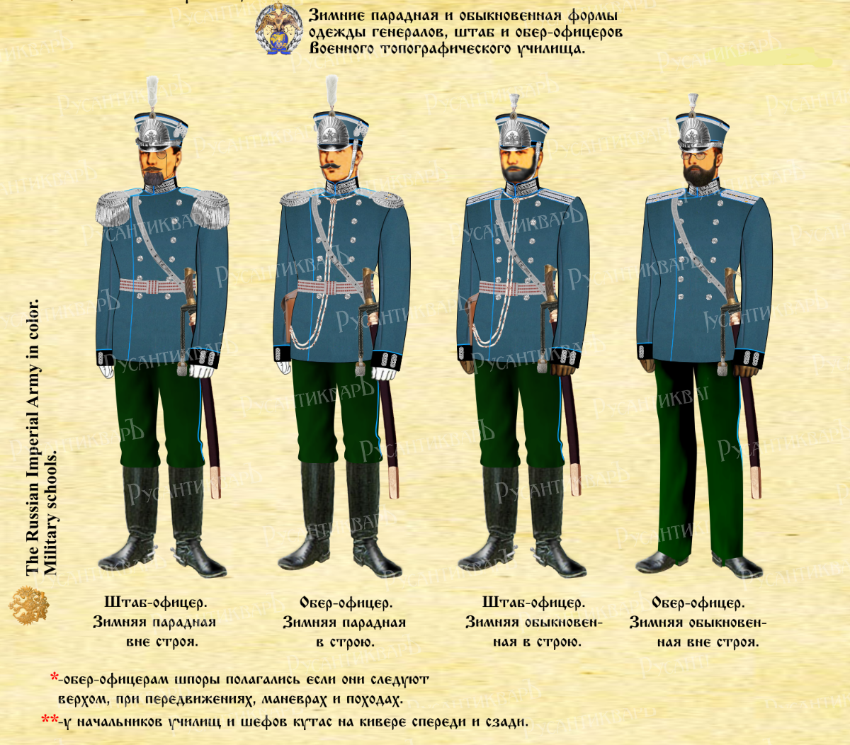В 1885 г. было в новь учреждено Военно-топографическое училище. Ему был положен серебряный прибор. Двубортный мундир образца армейской пехоты 1881 года, воротник и обшлага которого имели светло-синюю выпушку. Зимой юнкера надевали барашковую шапку образца 1881 г. с кокардой и гербом. Юнкера училища носили темно-зеленые погоны, со светло-синей выпушкой и желтой шифровкой в виде буквы «Т».