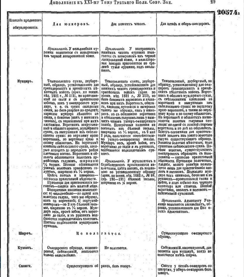 ФОРМА ЮНКЕРОВ. Остальным пехотным юнкерским училищам чуть позднее, в 1901 г., присвоено следующее обмундирование: прибор золотой - желтая медь, в отличие от пехотных военных училищ, где золотой прибор для юнкеров означал красную медь. Юнкера носили темно-зеленую (черную) фуражку, с алой выпушкой и светло-синим околышем с двумя алыми выпушками. Двубортный мундир образца гвардейской пехоты 1881 г., воротник и обшлага которого украшал золотой армейский унтер-офицерский галун. Шаровары были укороченные и длинные. Зимой юнкера по-прежнему носили барашковую шапку с кокардой и гербом.