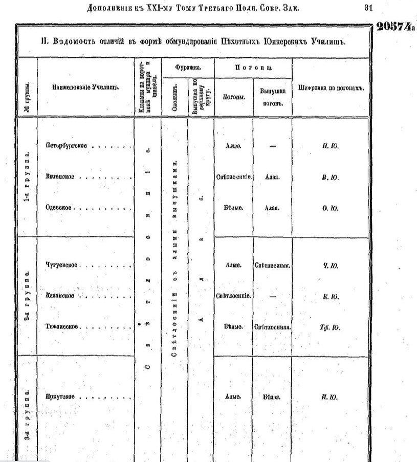 В том же 1909 г. Санкт-Петербургское и Казанское пехотные юнкерские училища были преобразованы в пехотные военные училища. Им было присвоено обмундирование, схожее с обмундированием Павловского и Александровского военных училищ. Одновременно Алексеевское и Киевское военные училища получили золотой прибор вместо серебряного. Годом позже в военные были преобразованы Одесское, Чугуевское, Виленское, Иркутское и Тифлисское училища.