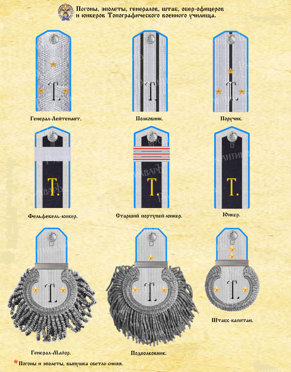 В 1886 года была утверждена курсивная буква , но уже с 1911 года буква была заменина на прямую.По свободным краям погоны украшал серебряный галун.
