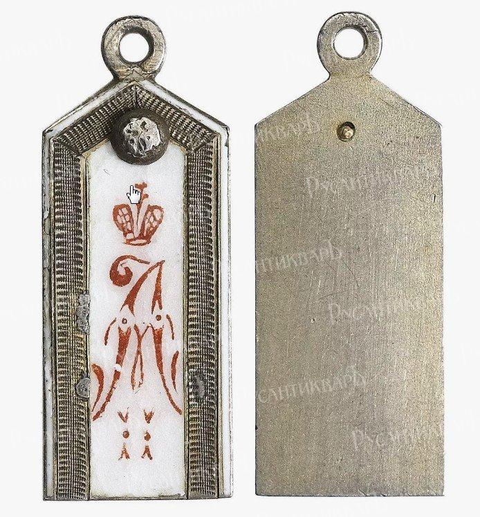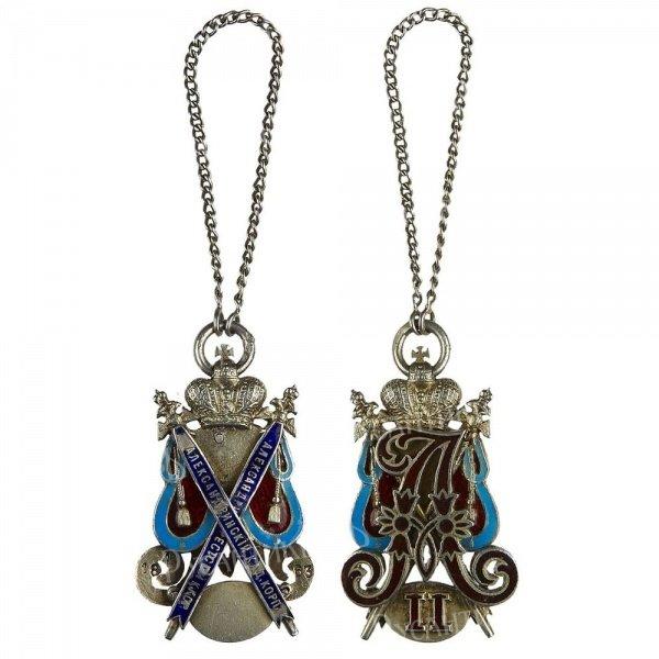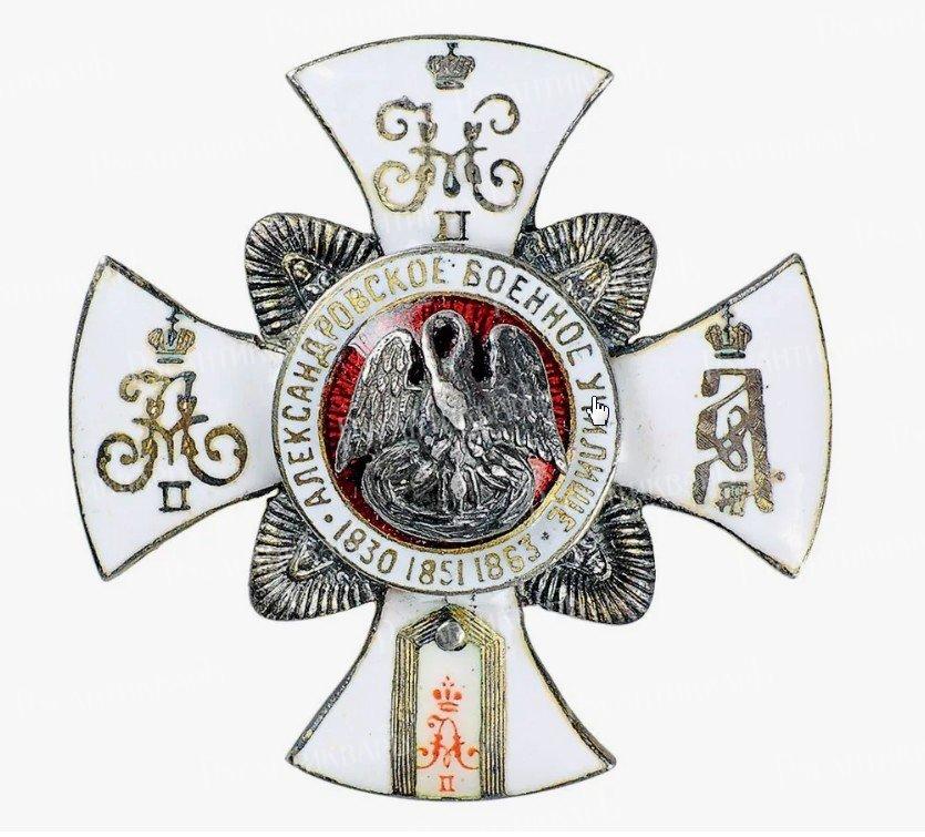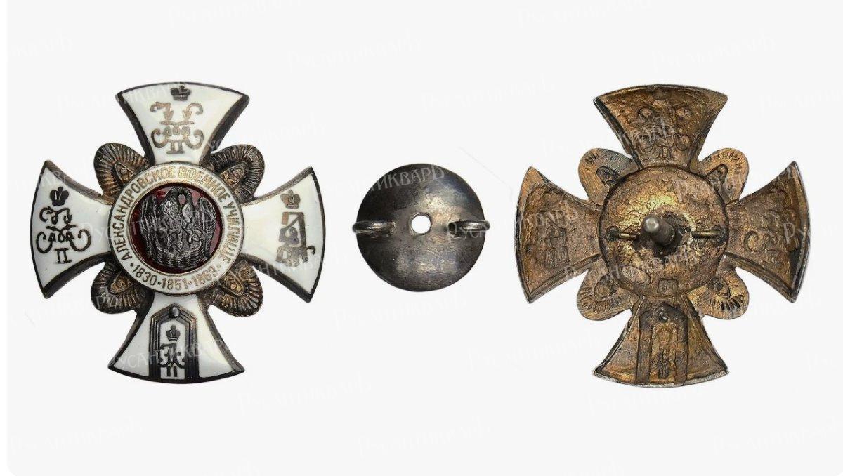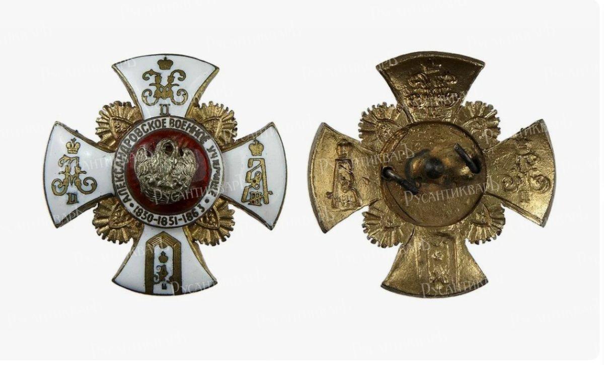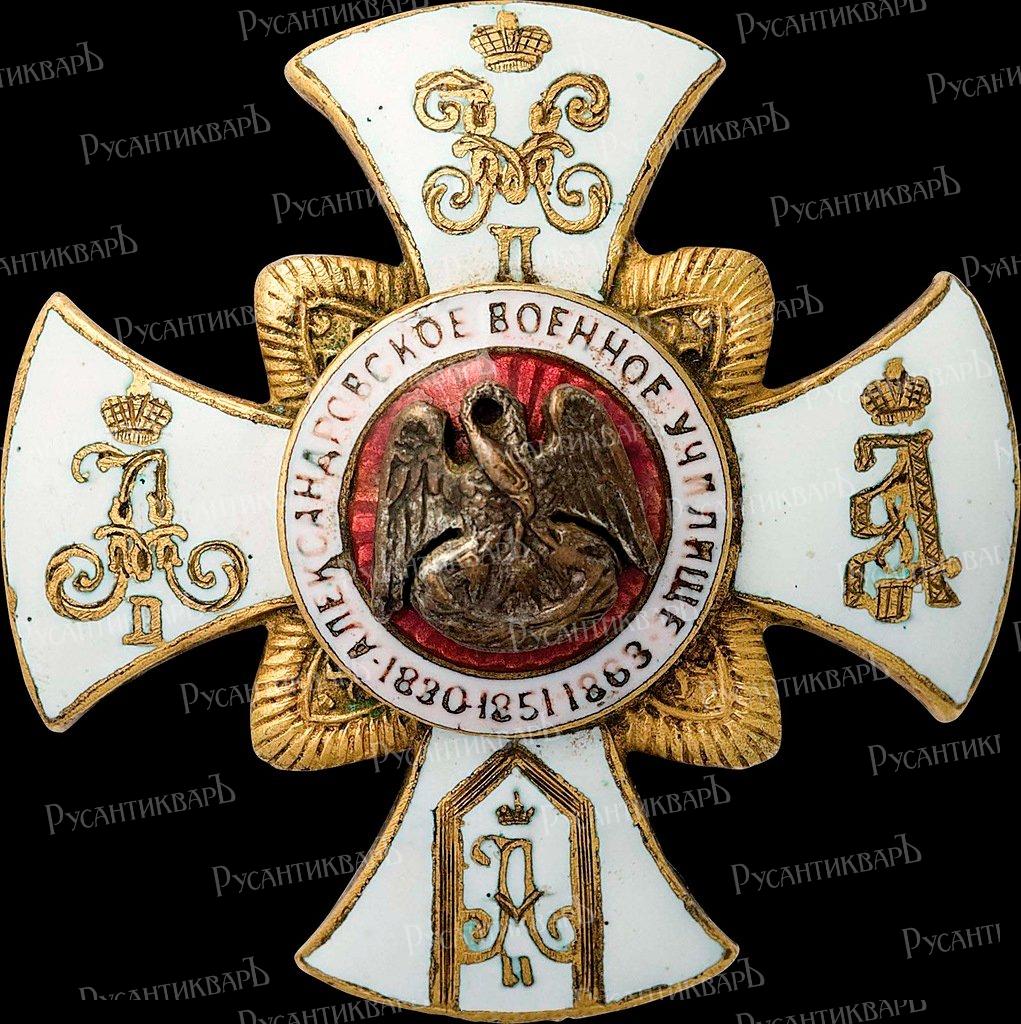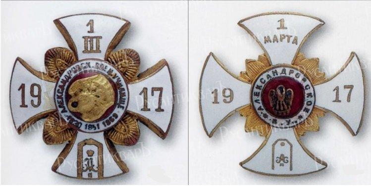 Белый эмалевый крест, между концами которого расположены кадетские золотые гербы. В центре круглый красный щит, обрамленный белой лентой, с надписью: «Александровское военное училище. 1830-1851-1863». На щите помещен серебряный пеликан, кормящий своих птенцов, — эмблема Александрийского сиротского института. На верхнем и боковых концах креста вензеля Императоров Александра II, Александра III и Николая II, на нижнем — белый погон с золотым басоном и вензелем Императора Александра II. Знак золотой. Вензеля делались накладные или штампованные.
