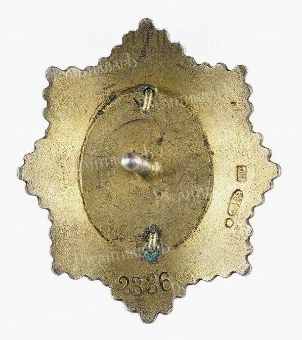 Знак выполнен в виде граненой восьмиконечной звезды,в центре которой овальный щиток синей эмали.Щит обрамляет узкая красная эмалевая лента.По верх щита накладной золотой венок на который наложен золотой двуглавый орел,увенчанный Императорской короно.На груди орла накладной эмалевый щиток красной эмали с гербом Москвы.Над орлом накладные вензеля Александра II и Николая II,а под орлом даты: 1865 и 1897.Между датами на ленте синей эмали буквы: КВУ — Константиновское военное училище.На реверсе обычно гравировался номер выдачи знака.
