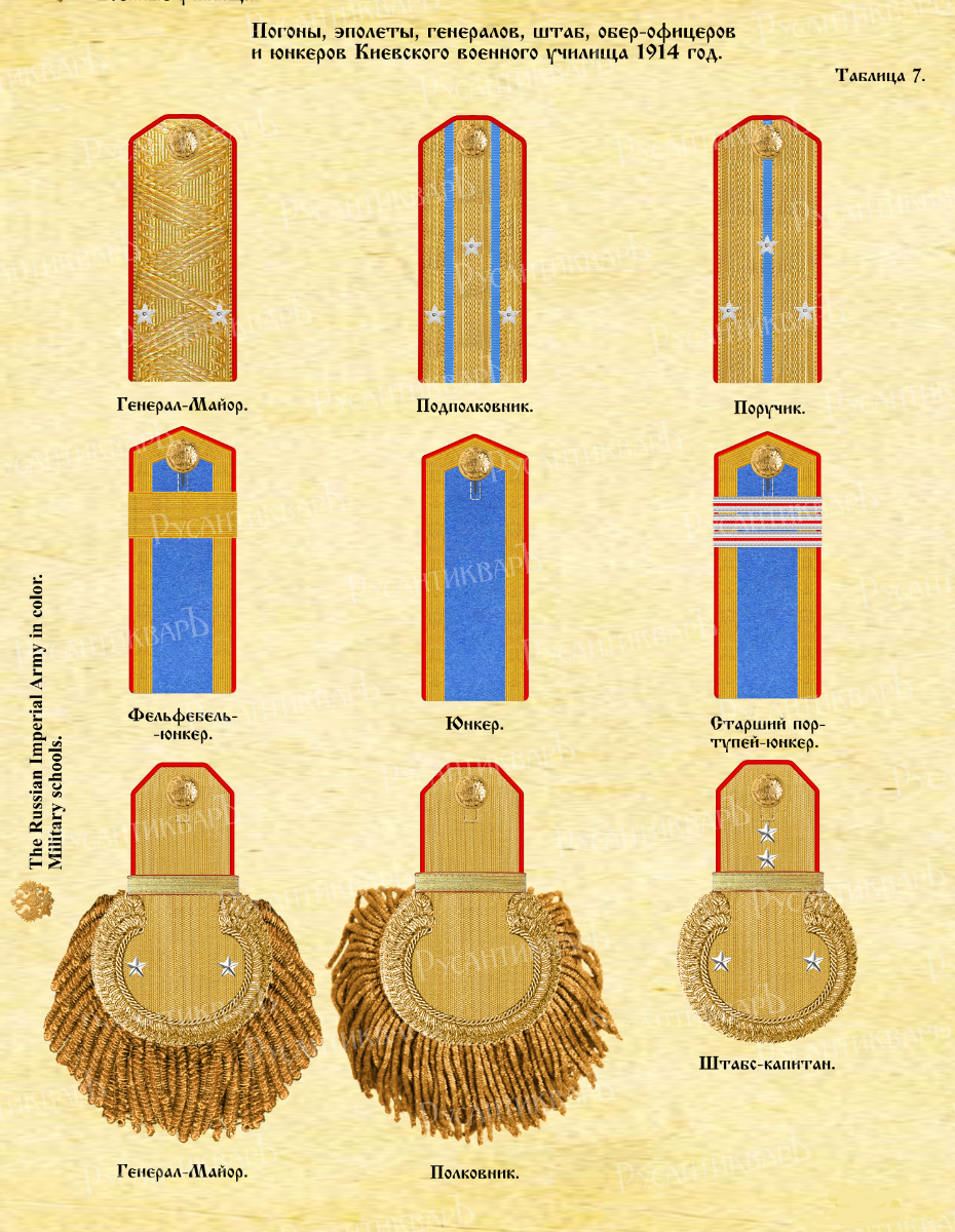 Погоны юнкеров Киевского училища. После смерти великого князя Константина Константиновича 1-му Киевскому военному училищу 24 июня 1915 года присвоено наименование «1-е Киевское Великого Князя Константина Константиновича военное училище». На погонах появился алый вензель Константина Константиновича в виде буквы «К».