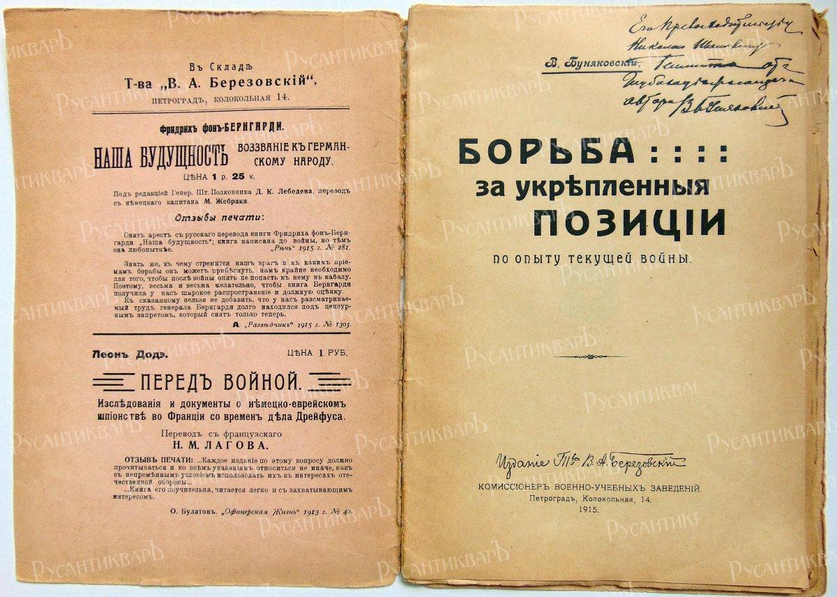 -Буняковский В. В. Борьба за укрепленные позиции по опыту текущей войны. Петроград, 1915. Издание В. А. Березовский, 48 с. со схемами.