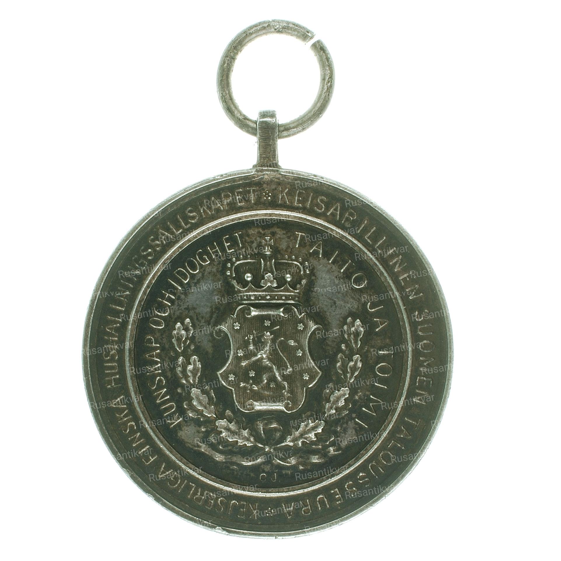 Реверс: по центру изображение герба Великого княжества Финляндского состоящего из гербового изображения стоящего на задних лапах льва, держащего в правой лапе рыцарский меч и попирающего задними лапами саблю. Композиция увенчана княжеской короной и обрамлена дубовым венком. Надпись по окружности в малом кругу на шведском и финском языках KUNSKAP OCH IDOGHET. TAITO JA TOIMI (Перевод: ЗНАНИЯ И ТРУД). Надпись по окружности в большом кругу на шведском и финском языках KEJSERLIGA FINSKA HUSHÅLLNINGSSÄLLSKAPET. KEISARILLINEN SUOMEN TALOUSSEURA (Перевод: ИМПЕРАТОРСКОЕ ФИНСКОЕ СЕЛЬСКОХОЗЯЙСТВЕННОЕ ОБЩЕСТВО). На 6 часов маркировка мастера – медальера состоящая из двух латинских букв C.J.